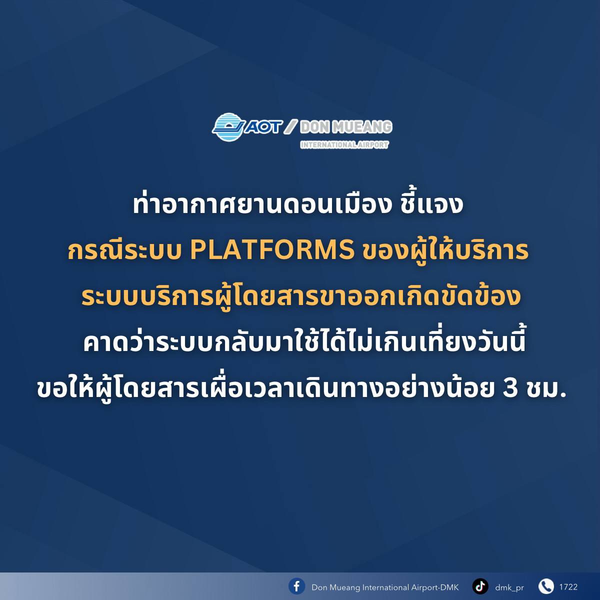 โดยสาเหตุมาจากการอัปเดตระบบภายในของตัวระบบดังกล่าวไม่สมบูรณ์ทำให้ระบบขัดข้อง ส่งผลกระทบต่อผู้โดยสารและสายการบิน ทำให้เที่ยวบินช่วงเช้าดีเลย์บางเที่ยวบิน ทดม.จึงได้ระดมกำลังเจ้าหน้าที่เข้าช่วยเหลือและอำนวยความสะดวกผู้โดยสารบริเวณเคาน์เตอร์เช็กอินของสายการบินที่ได้รับผลกระทบ อาทิ จัดเตรียมน้ำดื่มสำหรับผู้โดยสาร และอำนวยความสะดวกผู้โดยสารตลอดเส้นทางกระบวนการขาออก จัดเตรียมพื้นที่สำหรับพักคอยภายในอาคารผู้โดยสารเพิ่มเติม รวมทั้งเปิดเคาน์เตอร์เช็กอินให้กับสายการบินที่ได้รับผลกระทบเพิ่มเติม เพื่อเพิ่มขีดความสามารถในการให้บริการผู้โดยสาร และประสานงานกับหน่วยงานที่เกี่ยวข้อง เพื่อรีบดำเนินการแก้ไขให้กลับมาใช้งานได้เร็วที่สุด ซึ่งคาดว่าจะสามารถกลับมาใช้งานได้เป็นปกติภายในเวลา 12.00 น. ของวันนี้