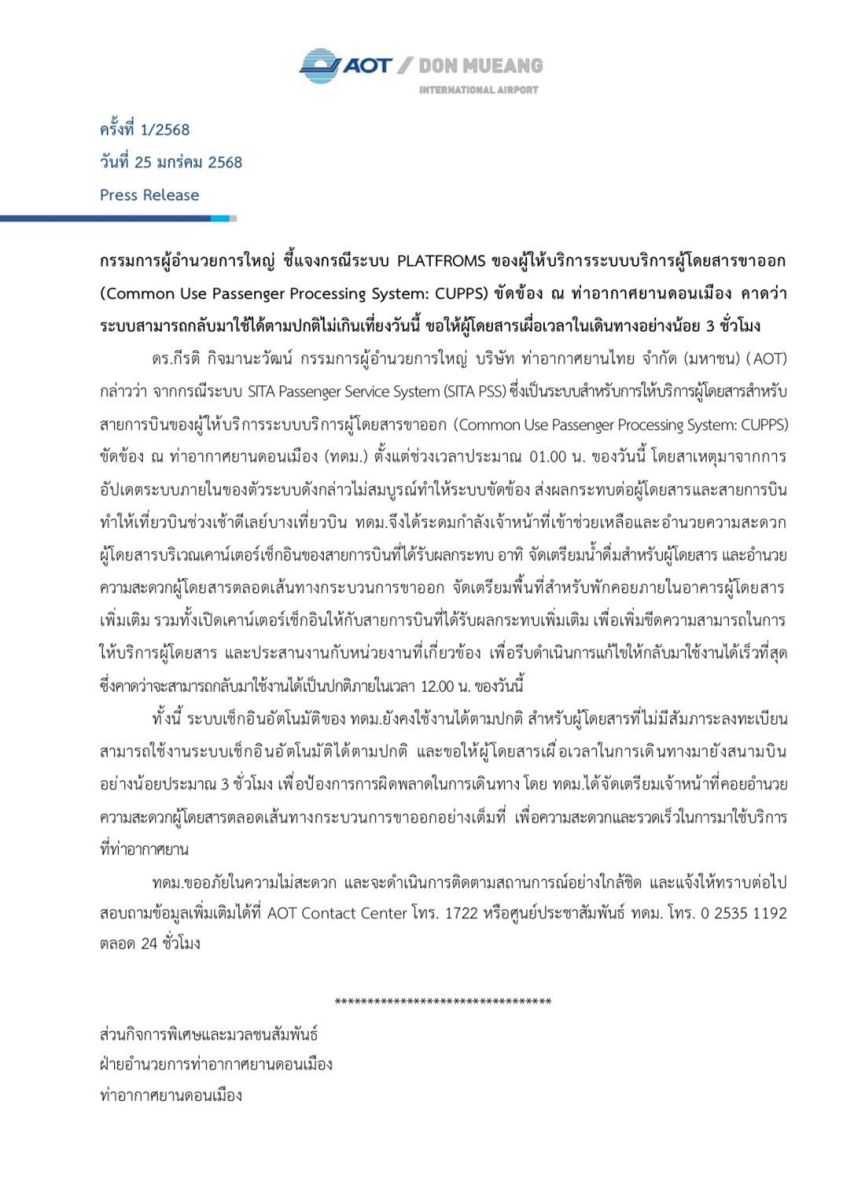 วันที่ 25 มกราคม 2568 ดร.กีรติ กิจมานะวัฒน์ กรรมการผู้อำนวยการใหญ่ บริษัท ท่าอากาศยานไทย จำกัด (มหาชน) (AOT) กล่าวว่า จากกรณีระบบ SITA Passenger Service System (SITA PSS) ซึ่งเป็นระบบสำหรับการให้บริการผู้โดยสารสำหรับสายการบินของผู้ให้บริการระบบบริการผู้โดยสารขาออก (Common Use Passenger Processing System: CUPPS) ขัดข้อง ณ ท่าอากาศยานดอนเมือง (ทดม.) ตั้งแต่ช่วงเวลาประมาณ 01.00 น. ของวันนี้