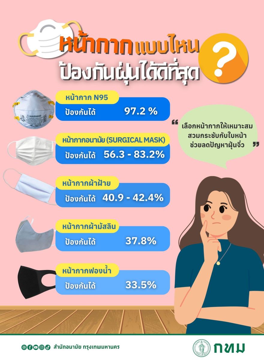 ล่าสุุด สำนักอนามัย กรุงเทพมหานคร ได้ออกมาให้ข้อมูลเกี่ยวกับการเลือกใช้หน้ากากอนามัย ในภาวะที่ค่าฝุ่นสูงแบบนี้ หน้ากากแบบไหนที่สามารถป้องกันฝุ่นได้มีประสิทธิภาพที่สุด แบ่งได้ดังนี้