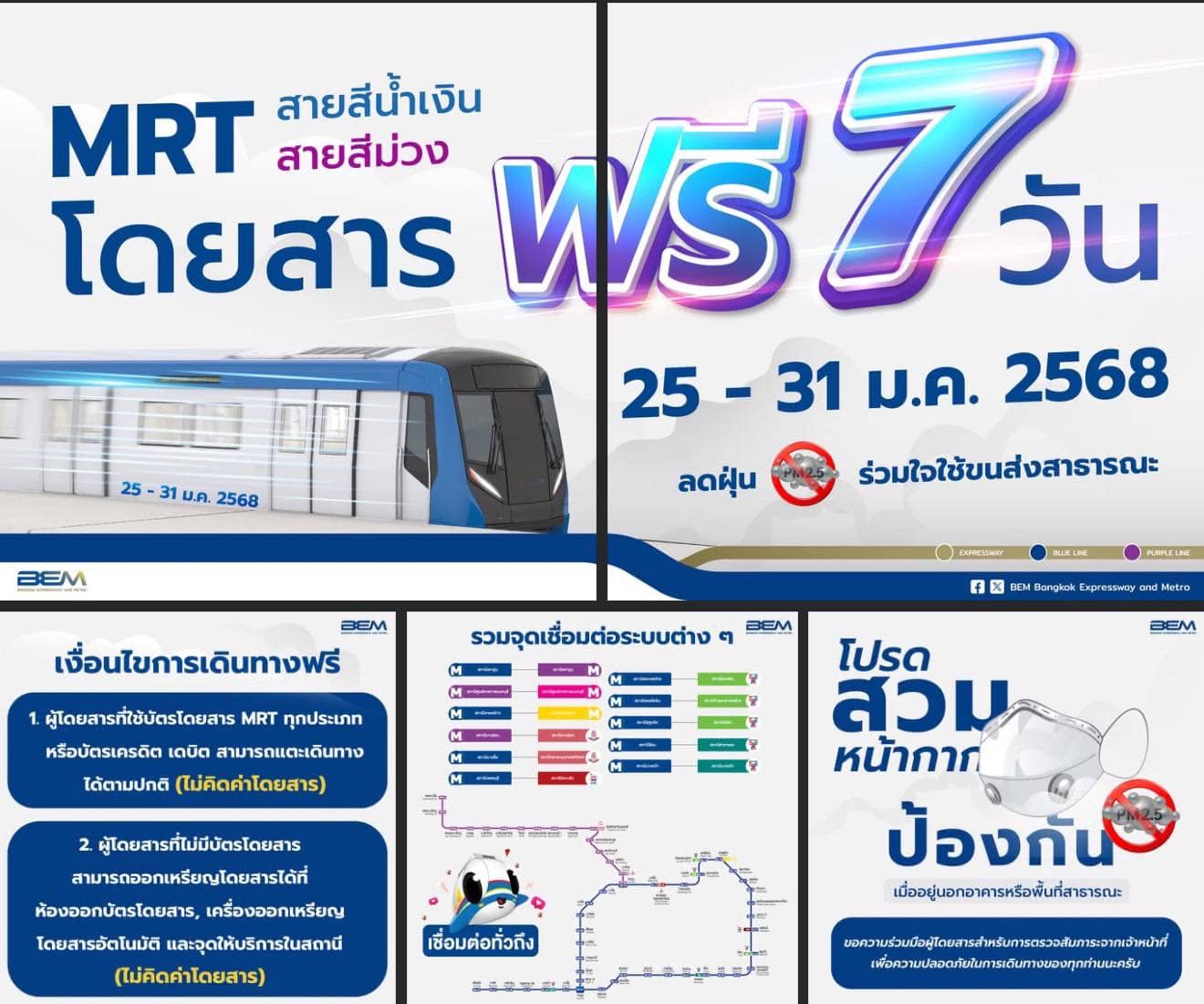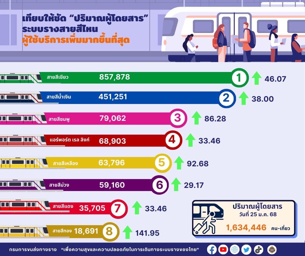 กรมการขนส่งทางรางเผยรถไฟฟ้าฟรี! วันแรก ตามมาตรการลดฝุ่นละออง PM2.5 ในเขตกรุงเทพมหานครและปริมณฑลของรัฐบาล พบว่ามีผู้ใช้บริการรถไฟฟ้ารวม 1.63 ล้านคน-เที่ยว เพิ่มขึ้นร้อยละ 45.29 เมื่อเทียบกับค่าเฉลี่ยวันเสาร์ในสามสัปดาห์ของเดือนมกราคม 2568
