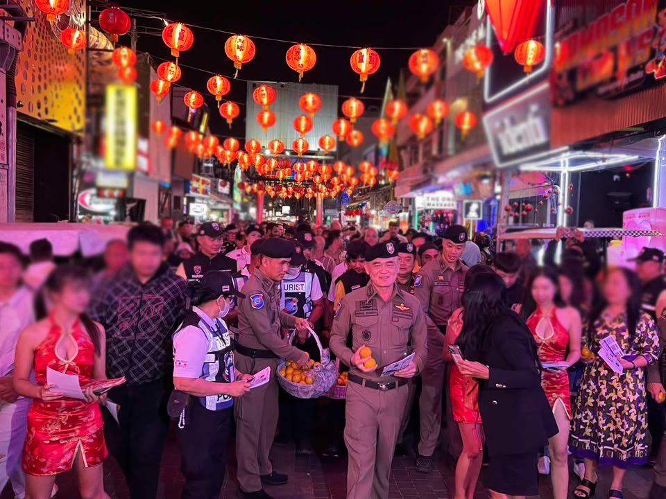 ตำรวจท่องเที่ยว - ตม. บูรณาการกำลังปล่อยแถว สร้างความเชื่อมั่นด้านความปลอดภัยในช่วงเทศกาลตรุษจีน พร้อมแจกส้มมงคล สร้างสีสันรอยยิ้มนักท่องเที่ยวตลอดทางถนนคนเดินวอล์คกิ้งสตรีทเมืองพัทยา