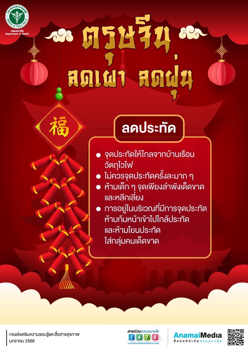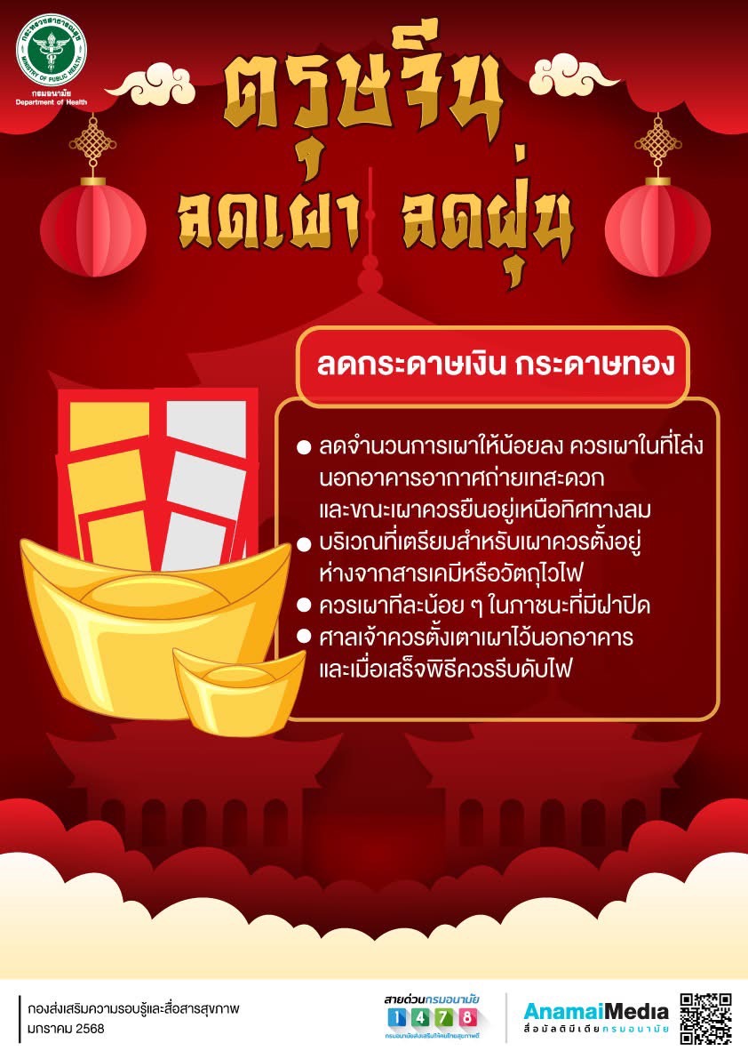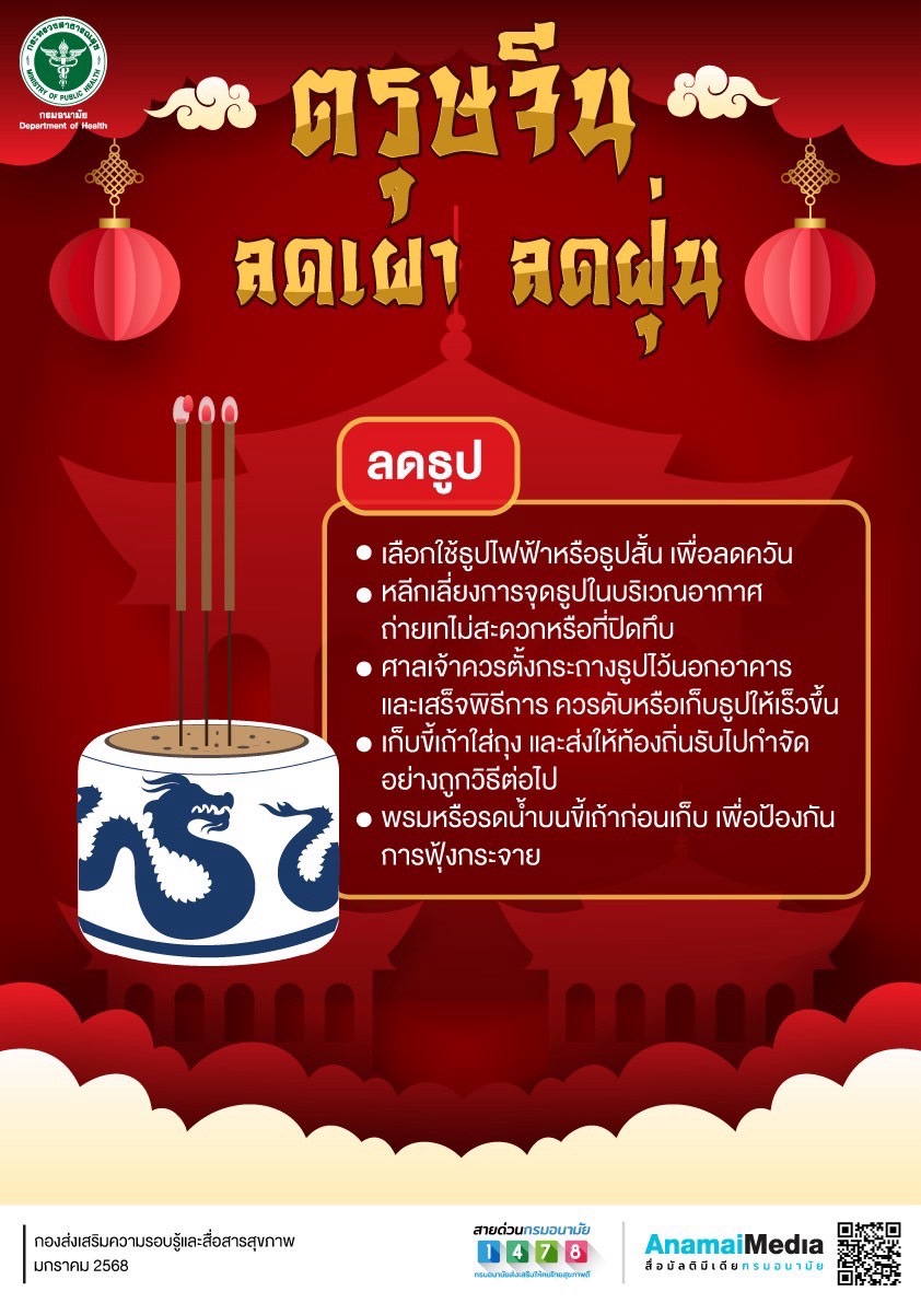 กรมอนามัย โดยกระทรวงสาธารณสุข ขอความร่วมมือประชาชน ฉลองเทศกาลตรุษจีนอย่างเป็นมิตรกับสิ่งแวดล้อม โดยการลดเผา ลดฝุ่น ด้วยการลด 3 แบบ 3 ชนิด ดังนี้
