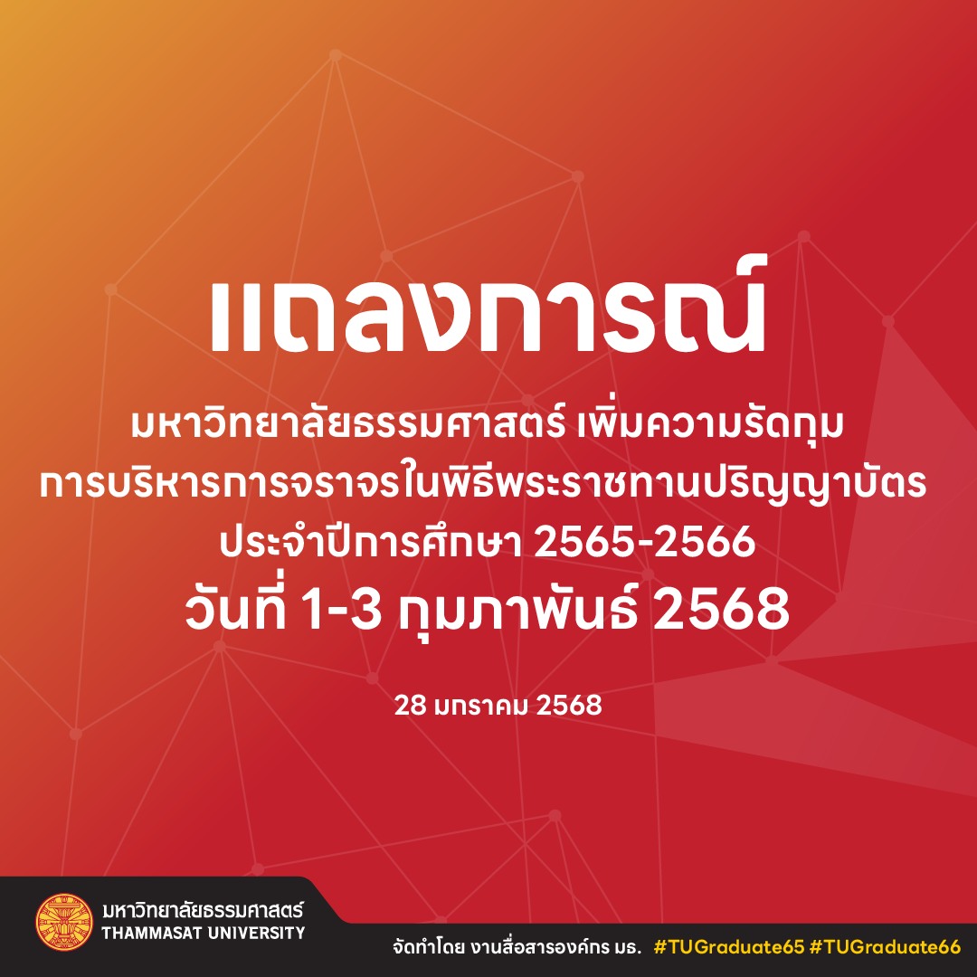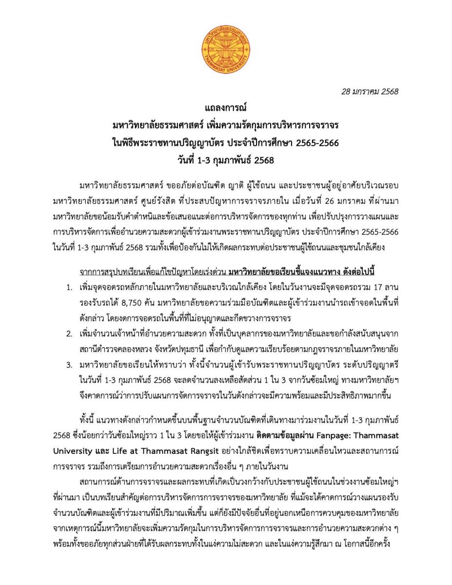 แถลงการณ์ มหาวิทยาลัยธรรมศาสตร์ เพิ่มความรัดกุมการบริหารการจราจร ในพิธีพระราชทานปริญญาบัตร ประจำปีการศึกษา 2565-2566 วันที่ 1-3 กุมภาพันธ์ 2568