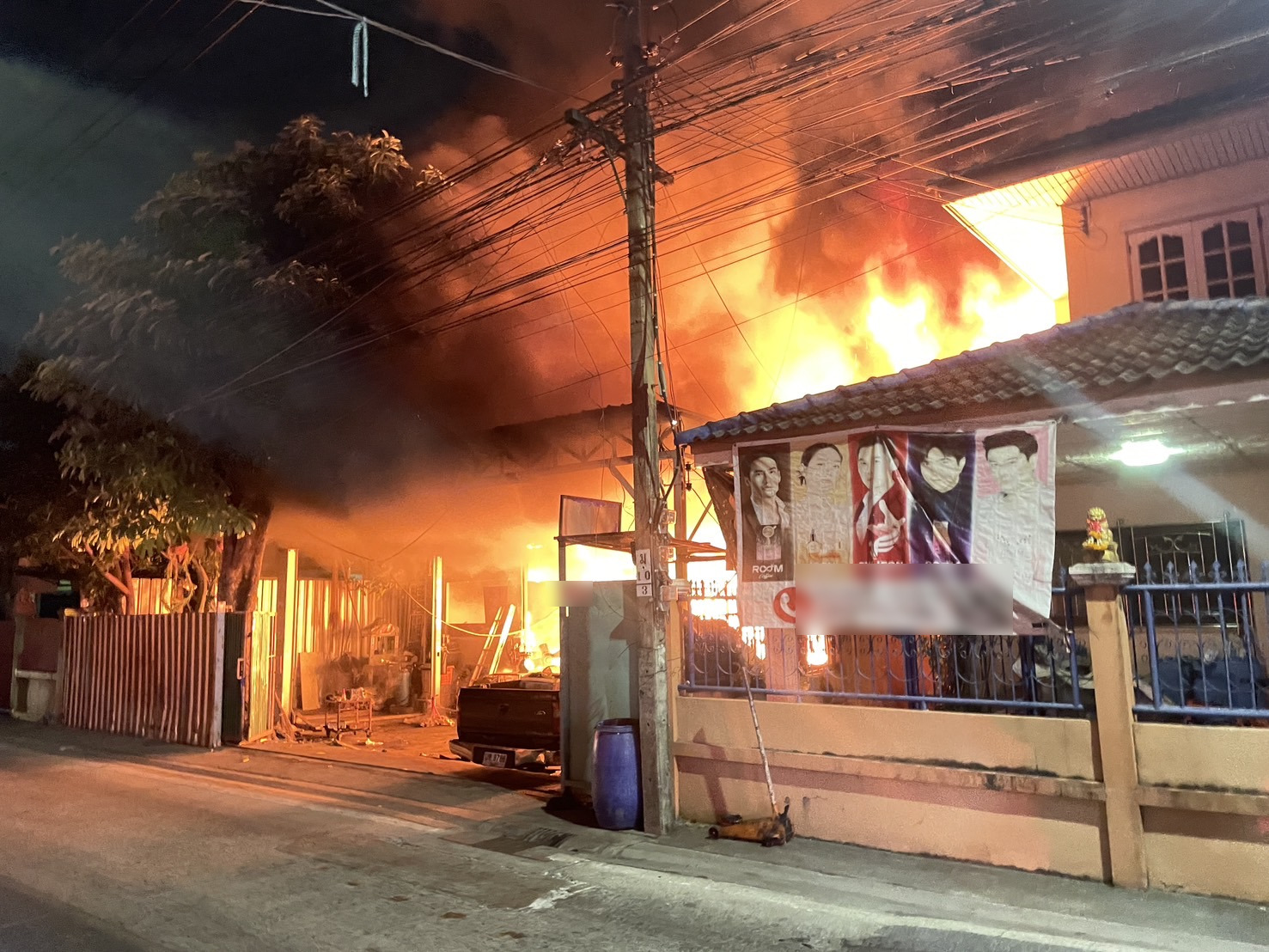 เวลา 00.28 น. เจ้าหน้าที่สถานีดับเพลิงและกู้ภัยบางชัน ถึงที่เกิดเหตุ ลักษณะที่เกิดเหตุเป็นบ้านไม้ เพลิงลุกลามรถยนต์เสียหายจำนวน 2 คัน เจ้าหน้าที่อยู่ระหว่างใช้น้ำ