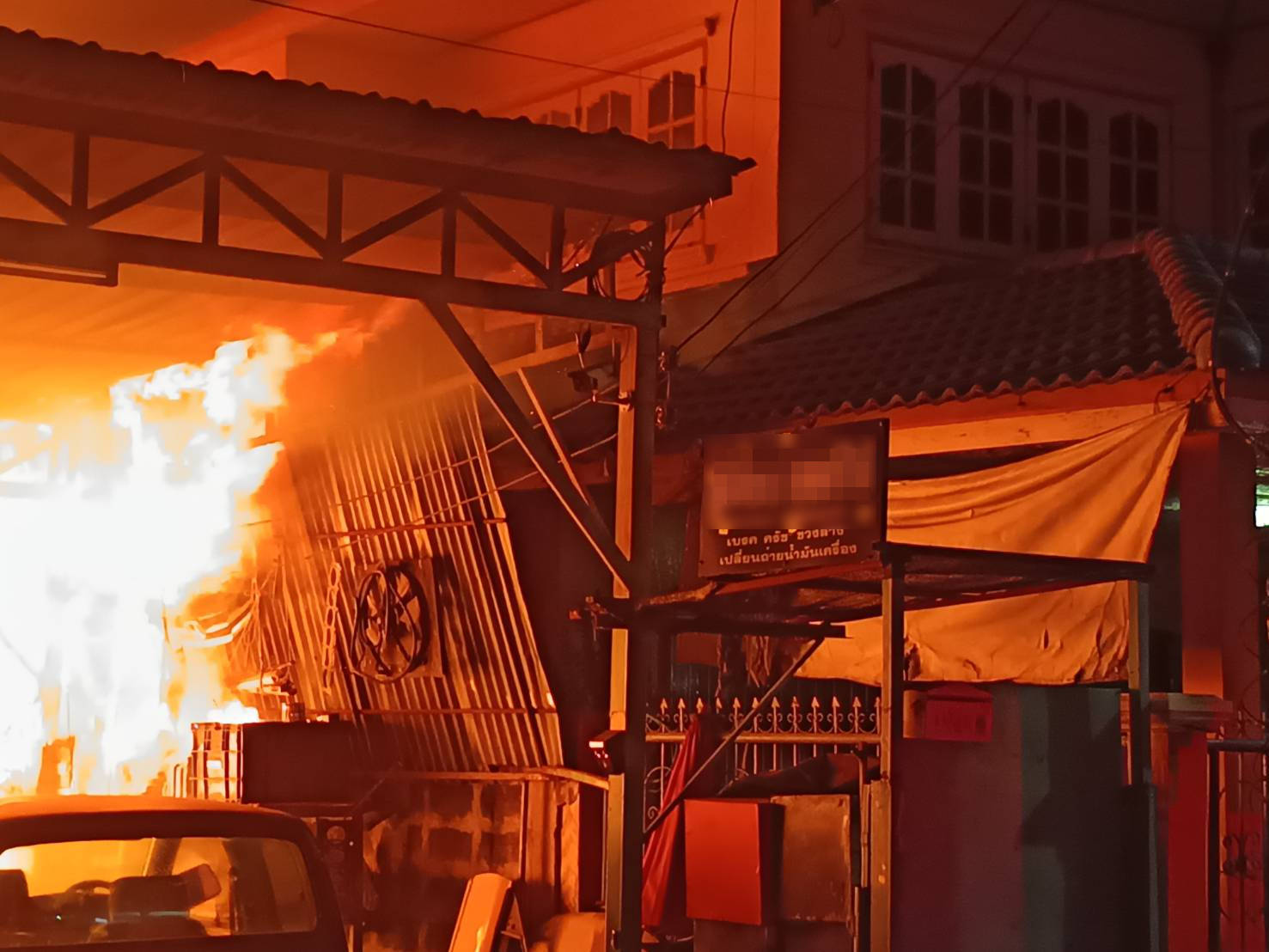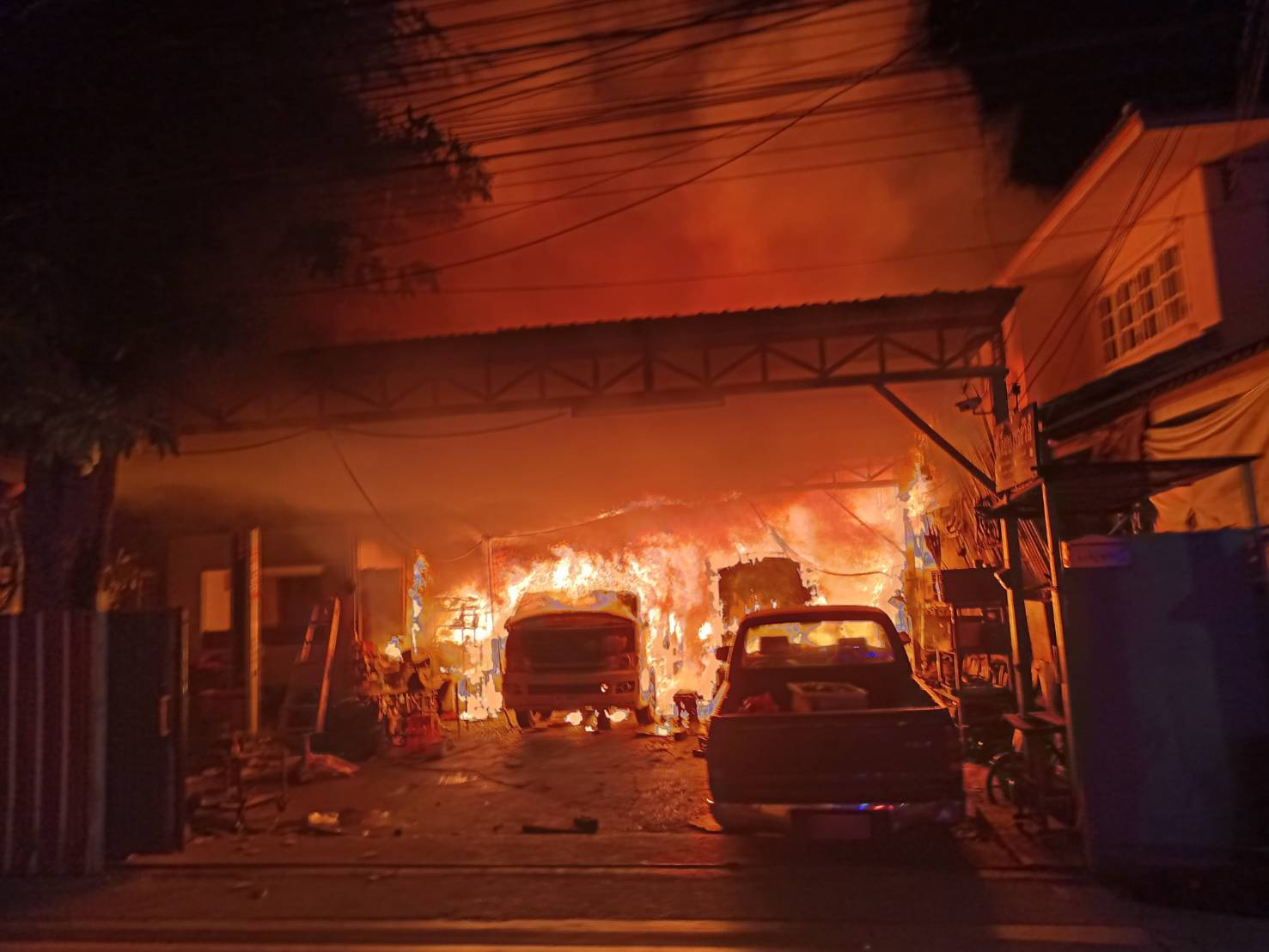 เวลา 00.40 น. เบื้องต้นเป็นอู่ซ่อมรถชั้นเดียว ล้อมรอบด้วยสังกะสี เจ้าหน้าที่วางหัวฉีดจำนวน 3 หัว ยังไม่มีทีท่าติดต่อลุกลาม