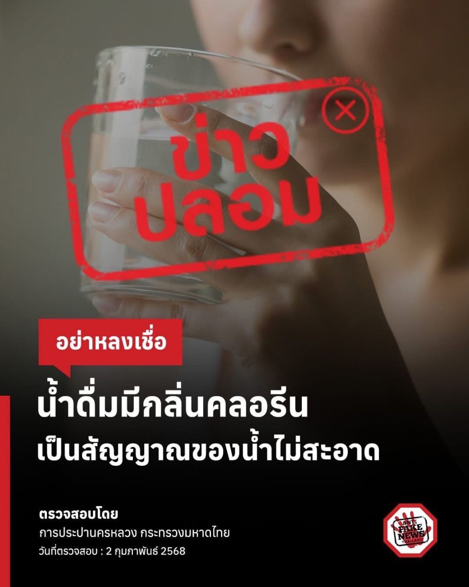 การประปานครหลวง (กปน.) เปิดเผยข้อมูลหลังสื่อสังคมออนไลน์ มีการเเชร์ข่าวปลอมว่า "ทดสอบกลิ่น - ถ้ามีกลิ่นคลอรีน สารเคมี หรือกลิ่นแปลก ๆ นั่นอาจเป็นสัญญาณของน้ำที่ไม่สะอาด"