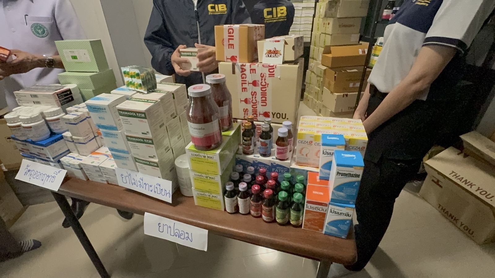 1. ยาทรามาดอล(ยาเขียวเหลือง) ปลอม ยี่ห้อ Pacmadol จำนวน 11,000 แคปซูล (เป็นยาที่ถูกยกเลิกทะเบียนแล้ว ตั้งแต่ปี 2555 และไม่มีทะเบียนใหม่ในชื่อการค้านี้ เข้าข่ายเป็นยาปลอม)