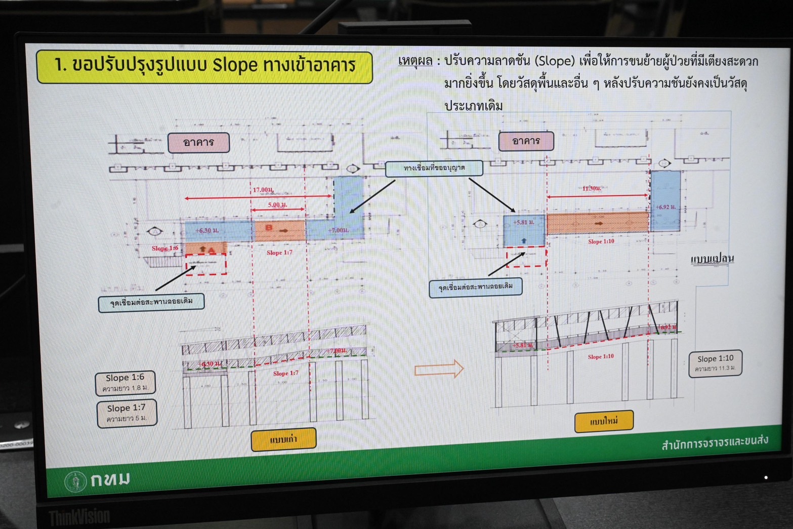 ที่ประชุมหารือกรณีบริษัท ระบบขนส่งมวลชนกรุงเทพ จำกัด (มหาชน) ขอปรับปรุงรูปแบบทางเชื่อมระหว่างระบบขนส่งมวลชนกรุงเทพมหานคร บริเวณสถานีรถไฟฟ้าบีทีเอสสยาม และสถานีรถไฟฟ้าบีทีเอสชิดลม กับอาคารเฉลิมพระเกียรติรัชกาลที่ 9 โรงพยาบาลตำรวจ (บางส่วน) รายละเอียดการขอปรับปรุง ประกอบด้วย 1. ขอปรับปรุง Slope ทางเข้าอาคาร โดยปรับความลาดชัน (Slope) จากเดิม 1:7 เป็น 1:10 เพื่อให้การขนย้ายผู้ป่วยที่มีเตียงสะดวกมากยิ่งขึ้น โดยวัสดุพื้นและอื่น ๆ หลังปรับความชันยังคงเป็นวัสดุประเภทเดิม ที่ประชุมมีมติเห็นชอบในหลักการให้ปรับ Slope ให้มีความลาดชันน้อยลง โดยขอให้พิจารณาปรับความลาดชันเป็น 1:12
