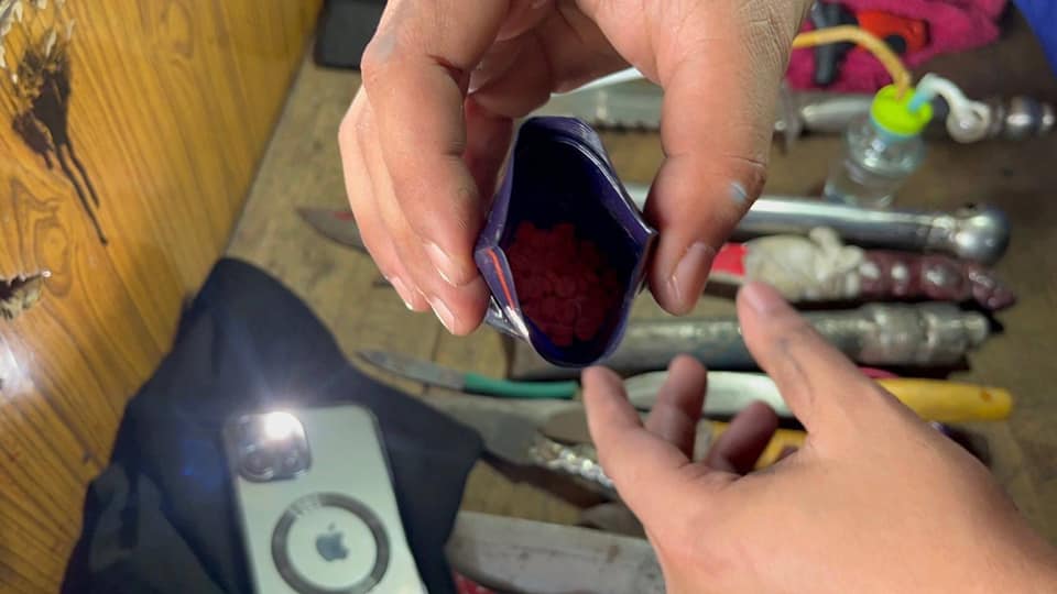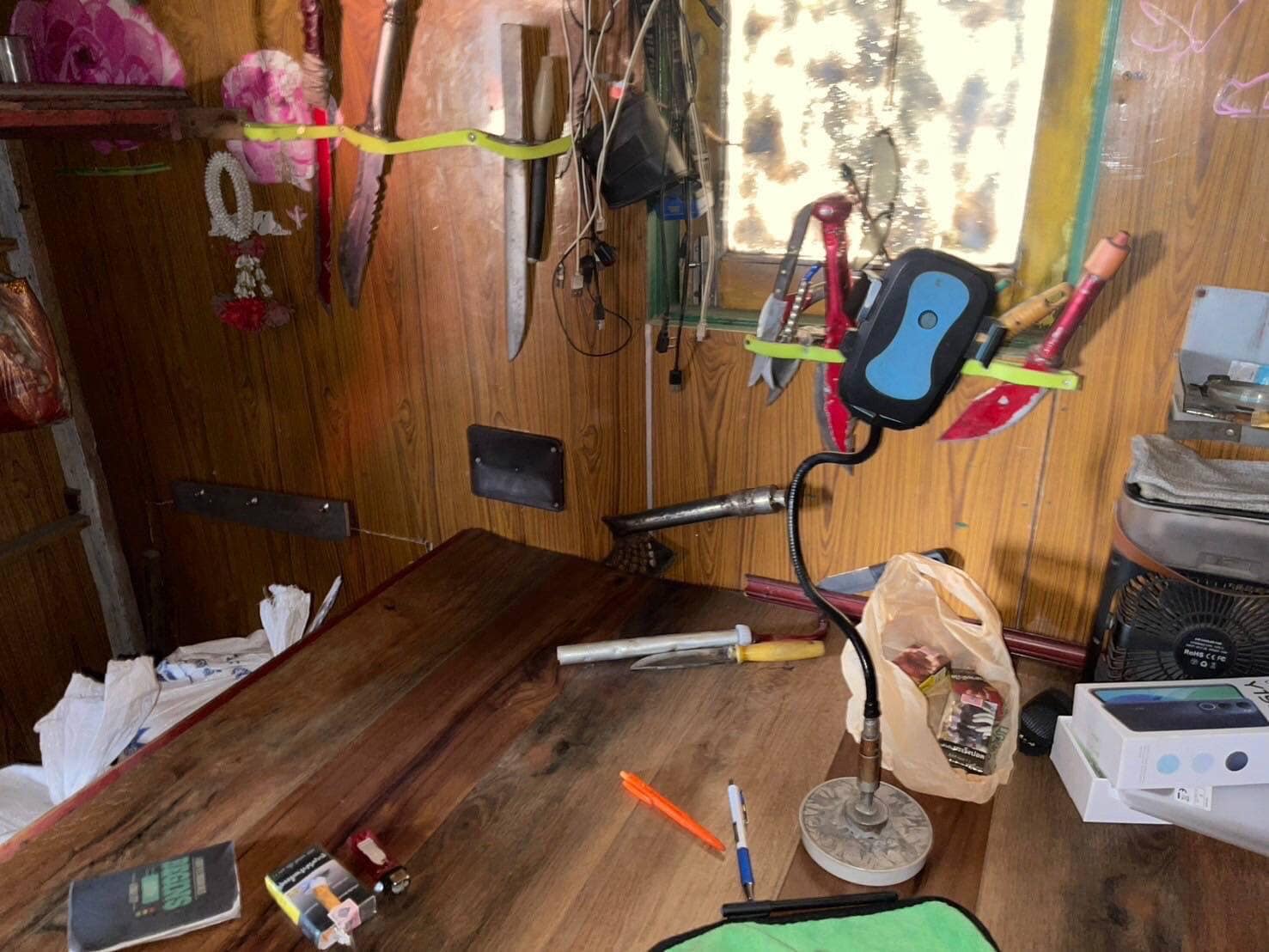 ในขณะที่เจ้าหน้าที่กำลังตรวจค้น ชายคนดังกล่าว ได้หลบหนีออกไปทางด้านหลังห้องนอนท้ายเรือ เจ้าหน้าที่ชุดจับกุมจึงแบ่งกำลังทำการค้นหาบริเวณจุดจอดเรือและเจ้าหน้าที่ชุดจับกุม พบยาเสพติดให้โทษประเภทที่ 1 เมทแอมเฟตามีน (ยาบ้า) จำนวน 704 เม็ด, อาวุธมีด 17 เล่ม, อาวุธปืนพกสั้นแบบไทยประดิษฐ์ จำนวน 2 กระบอก, สนับมือจำนวน 1 อัน, เหล็กขูดชาร์ป จำนวน 1 อัน บริเวณที่นอนในห้องนอนท้ายเรือลำดังกล่าว จากนั้นเจ้าหน้าที่ตำรวจได้นำตัวผู้ต้องหาพร้อมของกลางนำส่งพนักงานสอบสวนเพื่อดำเนินคดีตามกฎหมายต่อไป