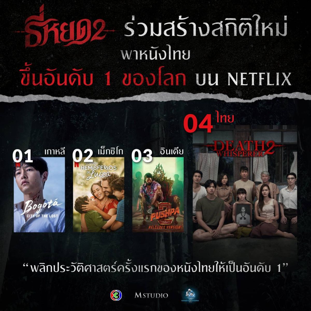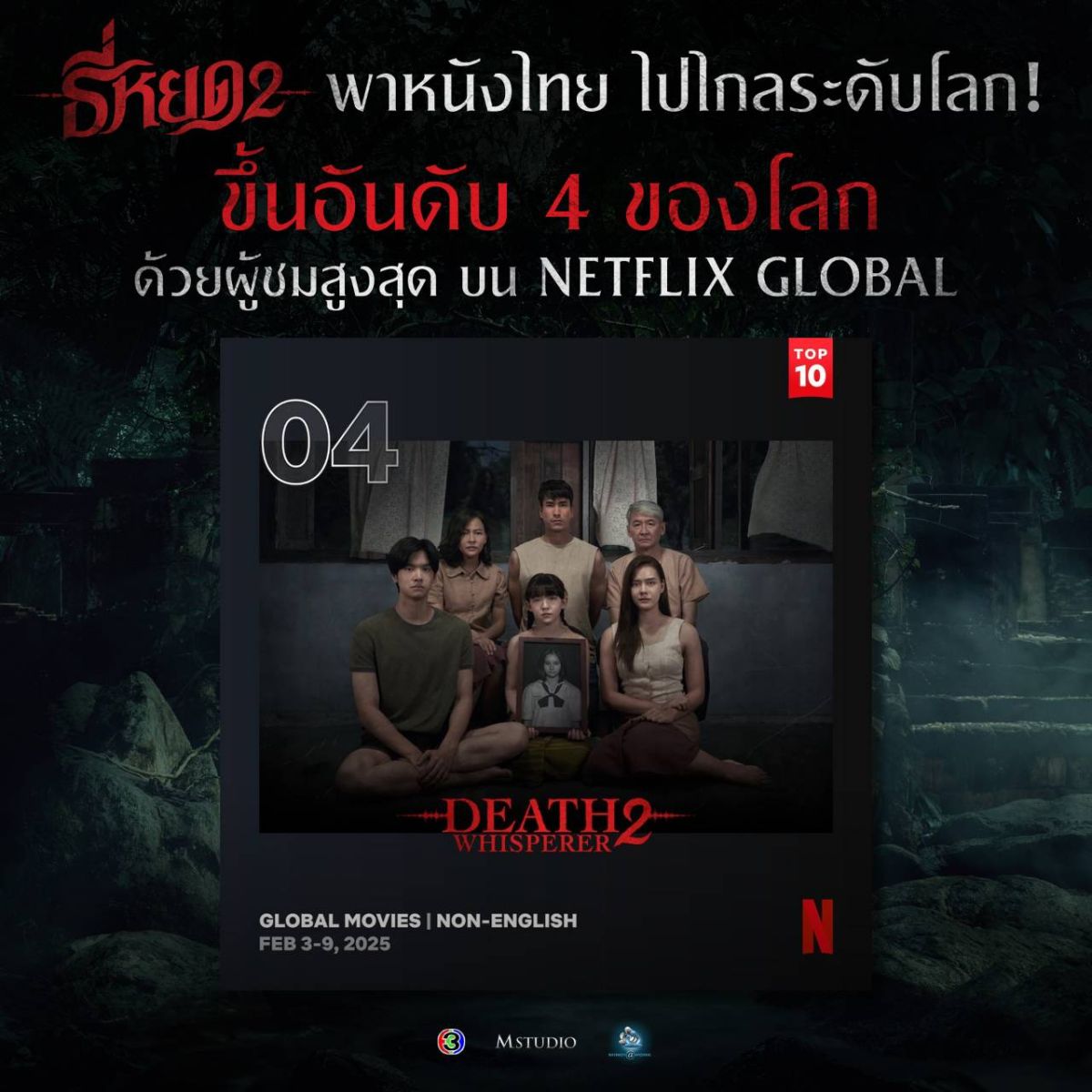 ภาพยนตร์ ธี่หยด 2 โดย M STUDIO และ ช่อง 3 สร้างปรากฏการณ์อีกครั้ง หลังจากกวาดรายได้จากการฉายในโรงภาพยนตร์ทั่วประเทศไทยไปได้ถึง 815 ล้านบาท ล่าสุดลงฉายในสตรีมมิ่ง Netflix มาได้ 1 สัปดาห์ ก็ขึ้นแท่นครองอันดับ 1 ของภาพยนตร์ที่มีผู้ชมสูงสุดในประเทศไทย และขึ้นอันดับ 4 ของโลก (Non-English) และยังติดอันดับ TOP 10 ในอีก 7 ประเทศทั่วโลก ถือเป็นอีกหนึ่งภาพยนตร์ไทยที่ได้รับกระแสตอบรับอย่างท่วมท้นจากผู้ชมทั่วโลก และยังทำให้ ธี่หยด ภาคแรก กลับมาติดอันดับ TOP 10 ในหมวดภาพยนตร์อีกด้วย