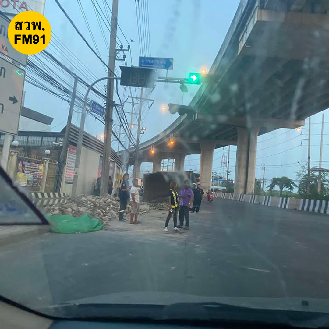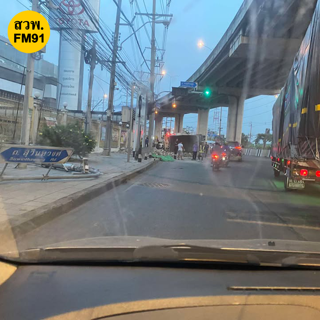 ถ.สุวินทวงศ์ ขาออก บริเวณแยกการไฟฟ้า มีนบุรี หน้าศูนย์รถโตโยต้า รถบรรทุกพ่วงเบรกแตก ทำให้เสียหลักพลิกตะแคง ส่งผลกระทบติดต่อเนื่อง รามคำแหง และร่มเกล้า