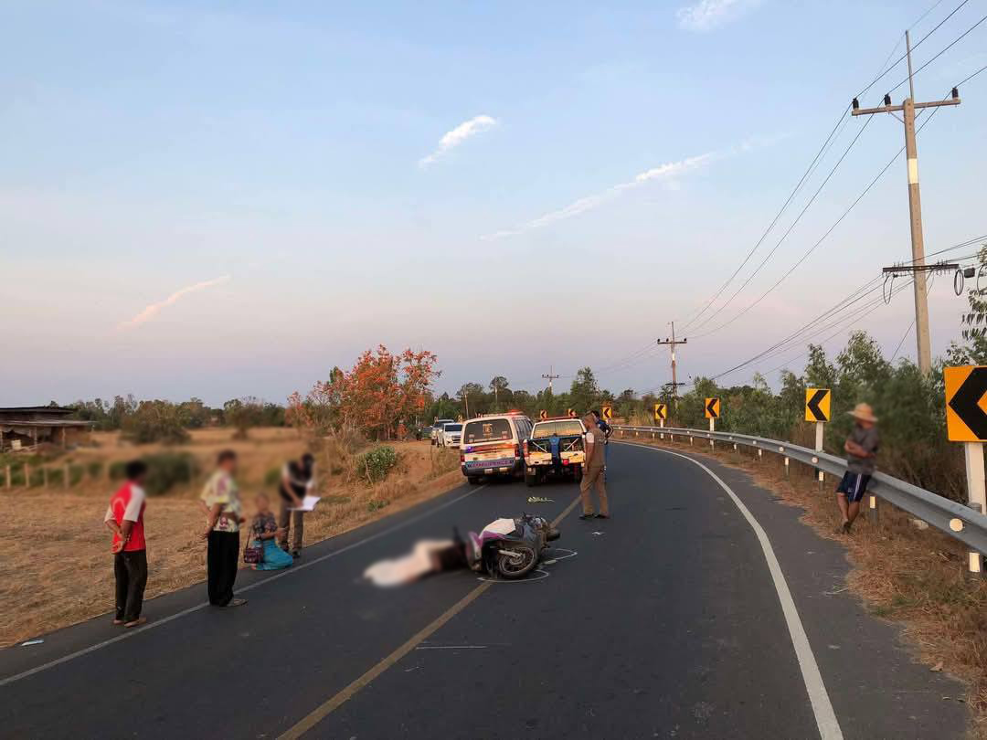 รถจักรยานยนต์พลิกคว่ำช่วงทางโค้ง มีผู้เสียชีวิตชาย 1 ราย กลางถนนสายเกษตรวิสัยน้ำอ้อม จ.ร้อยเอ็ด