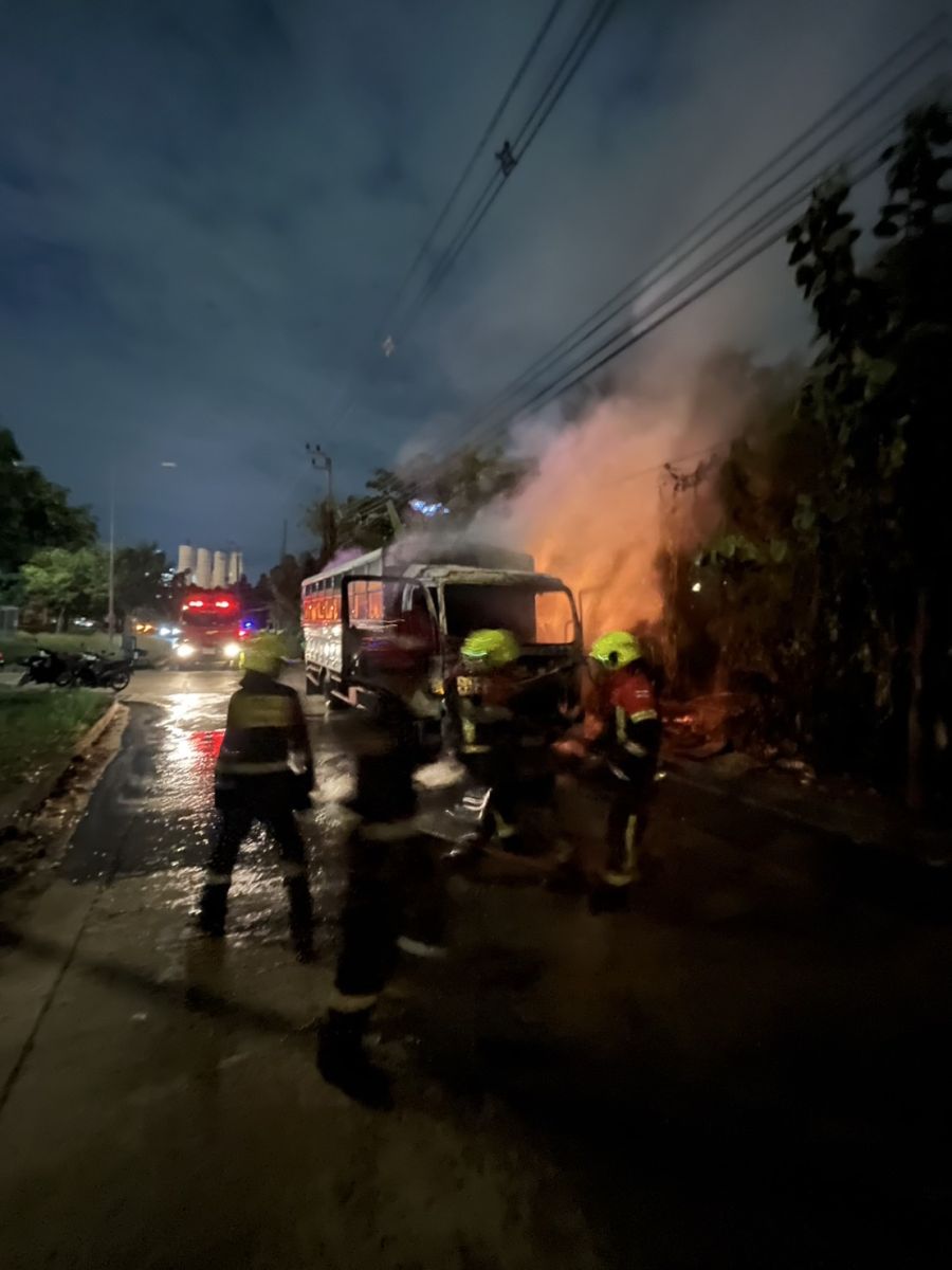 ลักษณะที่เกิดเหตุเป็นรถยนต์บรรทุก 6 ล้อ ยี่ห้อฮีโน่ สีขาว ป้ายทะเบียน กรุงเทพมหานคร รถใช้น้ำมันดีเซลเป็นเชื้อเพลิง เพลิงลุกไหม้เสียหายบริเวณห้องเครื่องรถยนต์ ลุกลามต้นไม้และรั้วบ้านเรือนประชาชนเสียหายเล็กน้อย รถดับเพลิงใช้น้ำทำการดับเพลิงสงบ