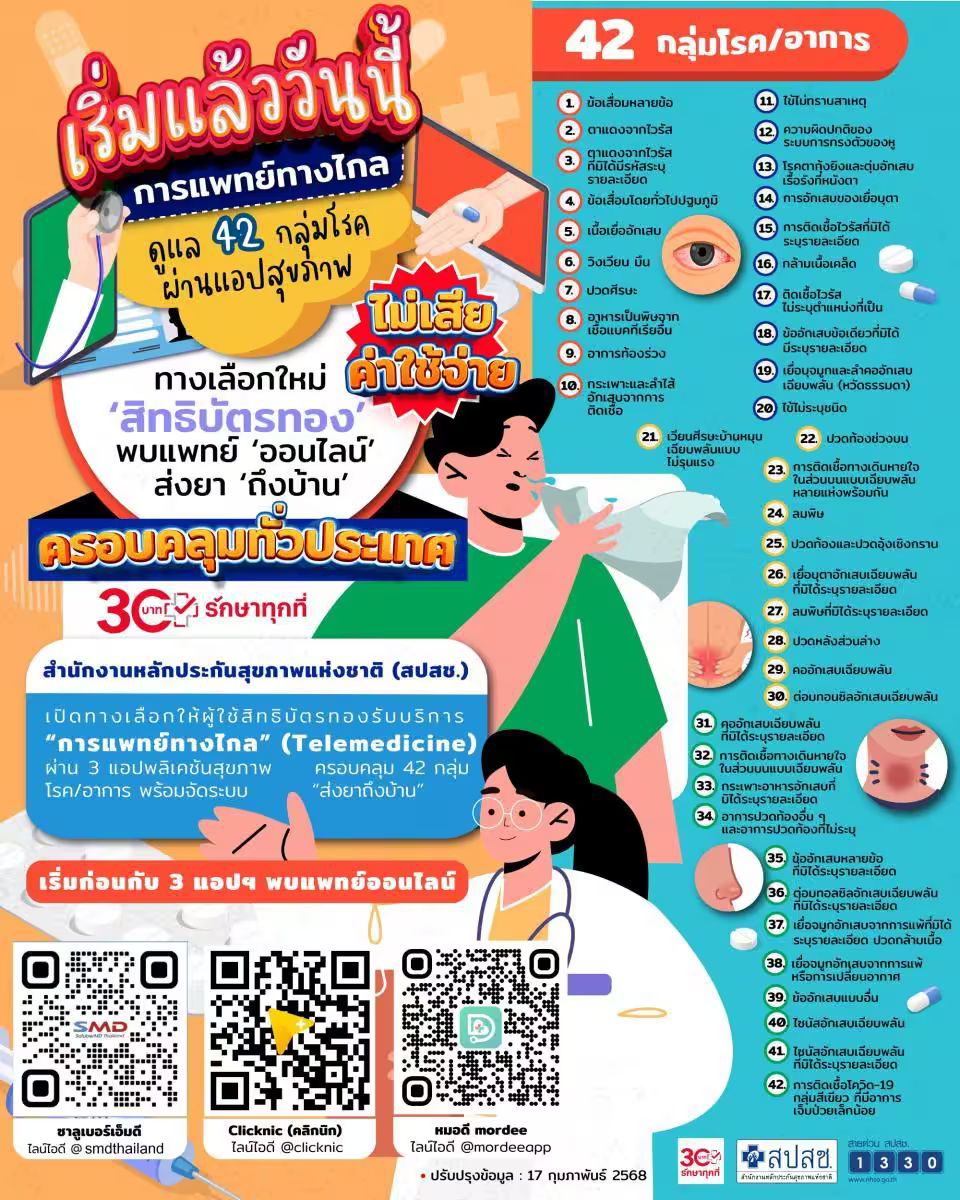 25 ก.พ. 2568 สำนักงานหลักประกันสุขภาพแห่งชาติ (สปสช.) เปิดทางเลือกให้ผู้ที่ใช้สิทธิบัตรทอง 30 บาท (สิทธิหลักประกันสุขภาพแห่งชาติ) ด้วยบริการ “การแพทย์ทางไกล (Telemedicine)” พบแพทย์ผ่านระบบออนไลน์พร้อมจัดส่งยาถึงบ้าน ครอบคลุมเจ็บป่วยเล็กน้อย 42 อาการ ครอบคลุมทั่วประเทศแล้วตั้งแต่วันนี้เป็นต้นไป ไม่ว่าสิทธิบัตรทองจะอยู่ที่ไหนก็ใช้บริการได้ผ่าน 3 แอปพลิเคชันสุขภาพที่เข้าร่วม ขั้นตอนการใช้บริการ