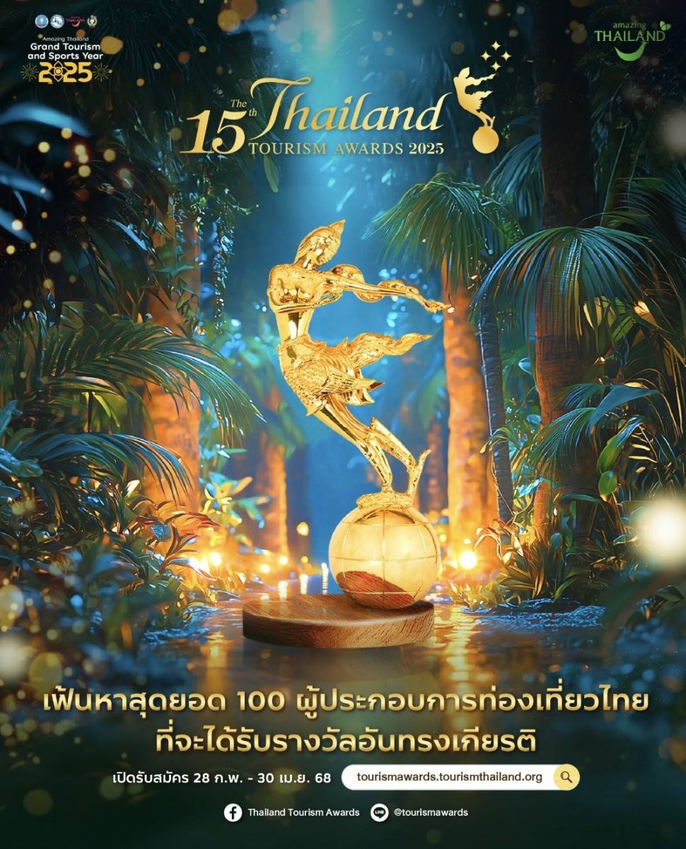 วันนี้ (26 ก.พ. 68) การท่องเที่ยวแห่งประเทศไทย (ททท.) แถลงข่าวเปิดตัวโครงการประกวดรางวัลอุตสาหกรรมท่องเที่ยวไทย (Thailand Tourism Awards) ครั้งที่ 15 ประจำปี 2568 ก้าวสู่ 3 ทศวรรษรางวัลแห่งเกียรติยศ พร้อมประกาศเพิ่มรางวัลแห่งความยั่งยืน (Thailand Tourism Sustainability Awards) ครั้งแรก เพื่อเชิดชูผลงานที่มีความโดดเด่นด้านการบริหารจัดการความยั่งยืน โดยมีนางสาวฐาปนีย์ เกียรติไพบูลย์ ผู้ว่าการ ททท. เป็นผู้แถลงร่วมกับ ผศ. ดร. เอกก์ ภทรธนกุล ผู้แทนคณะกรรมการพิจารณาตัดสินฯ พร้อมด้วย นางวัลลภา ไตรโสรัส ประธานเจ้าหน้าที่บริหารและกรรมการผู้จัดการใหญ่ บริษัท แอสเสท เวิรด์ คอร์ป จำกัด (มหาชน) ผู้แทนผู้ได้รับรางวัลอุตสาหกรรมท่องเที่ยวไทย ครั้งที่ 14 ประจำปี 2566 ประเภทที่พักนักท่องเที่ยว และผู้บริหาร ททท. ให้เกียรติเข้าร่วมงาน เชิญชวนผู้ประกอบการท่องเที่ยวทั่วประเทศสมัครเข้าร่วมการประกวดเพื่อเฟ้นหาสุดยอด 100 ผู้ประกอบการท่องเที่ยวไทยที่มีคุณภาพและมีมาตรฐานการบริการที่ยอดเยี่ยม เปิดรับสมัครแล้วตั้งแต่วันที่ 28 กุมภาพันธ์ - 30 เมษายน 2568 นี้