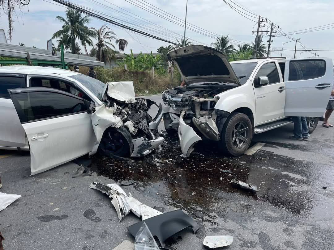 รถนั่งส่วนบุคคลชนประสานงากับรถกระบะ มีผู้บาดเจ็บ 3 และเสียชีวิต 2 ราย จ.นครปฐม