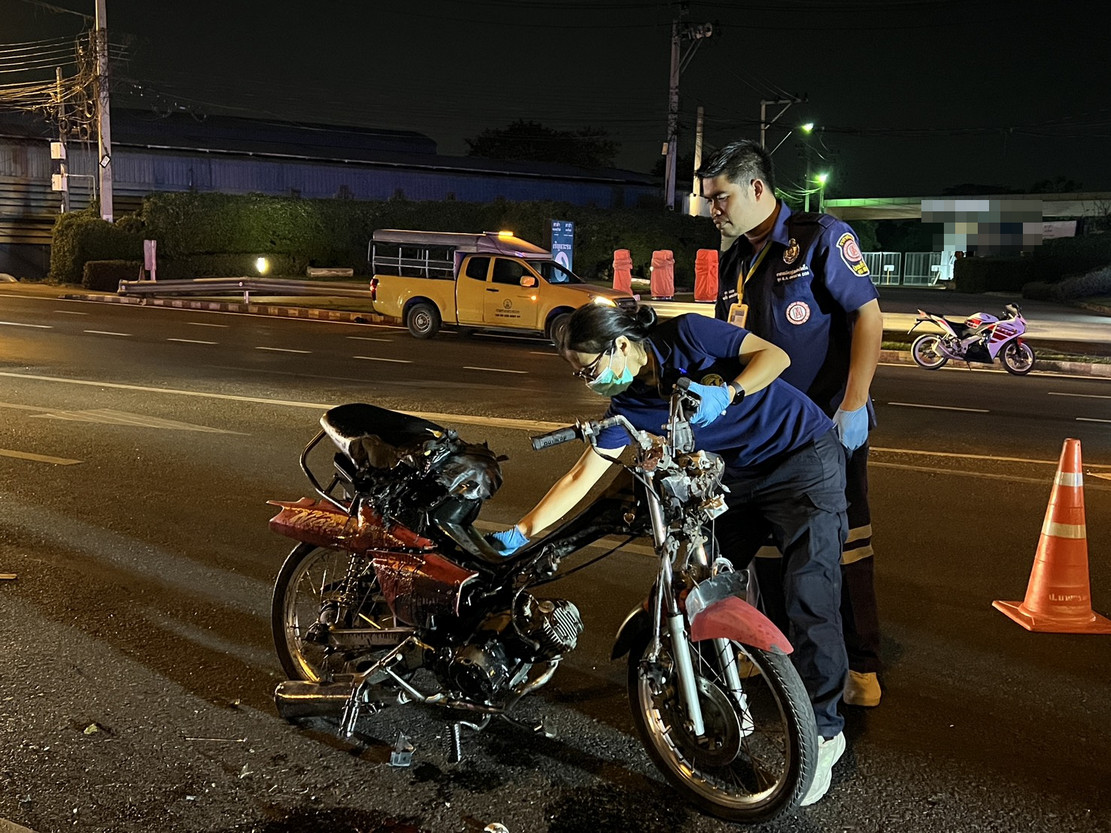 ที่เกิดเหตุ พบร่างผู้เสียชีวิต ตรวจสอบเอกสาร เป็นชายไทย อายุ 38 ปี นอนอยู่เลนขวาของถนน และห่างไปไกลกว่า 30 เมตร พบรถจักรยานยนต์ ยี่ห้อ ฮอนด้า รุ่น ไนช์ สีแดง ทะเบียน กทม สภาพของรถพังเสียหายยับเยิน ในที่เกิดเหตุไม่พบรถคู่กรณี พบแต่เพียงแผ่นป้ายทะเบียน 1 แผ่นรวมไปถึงเศษชิ้นส่วนของรถยนต์เก๋งตกหล่นอยู่ที่เกิดเหตุ