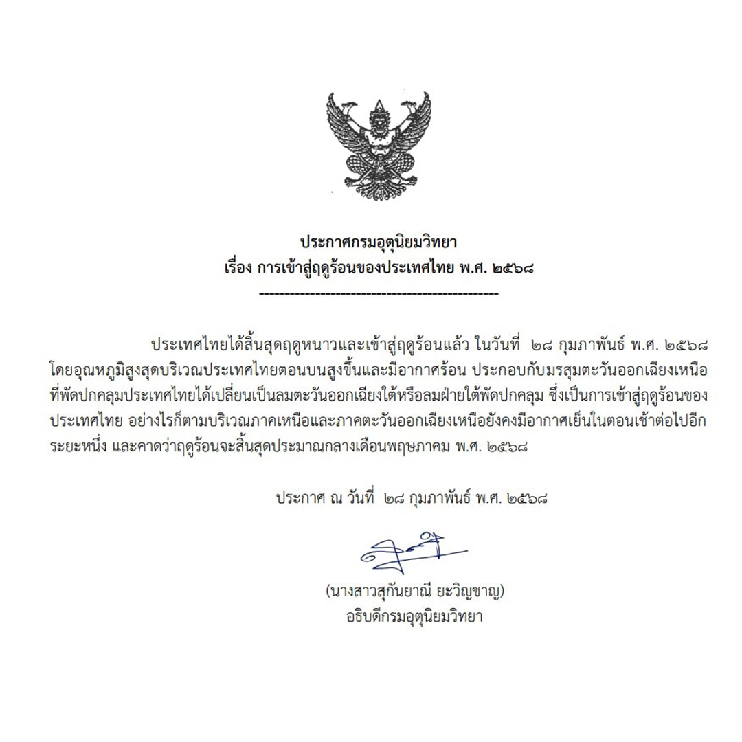 ประเทศไทยได้สิ้นสุดฤดูหนาวและเข้าสู่ฤดูร้อนแล้ว ในวันที่ 28 กุมภาพันธ์พ.ศ. 2568 โดยอุณหภูมิสูงสุดบริเวณประเทศไทยตอนบนสูงขึ้นและมีอากาศร้อน ประกอบกับมรสุมตะวันออกเฉียงเหนือที่พัดปกคลุมประเทศไทยได้เปลี่ยนเป็นลมตะวันออกเฉียงใต้หรือลมฝ่ายใต้พัดปกคลุม ซึ่งเป็นการเข้าสู่ฤดูร้อนของประเทศไทย อย่างไรก็ตามบริเวณภาคเหนือและภาคตะวันออกเฉียงเหนือยังคงมีอากาศเย็นในตอนเช้าต่อไปอีกระยะหนึ่ง และคาดว่าฤดูร้อนจะสิ้นสุดประมาณกลางเดือนพฤษภาคม พ.ศ. 2568