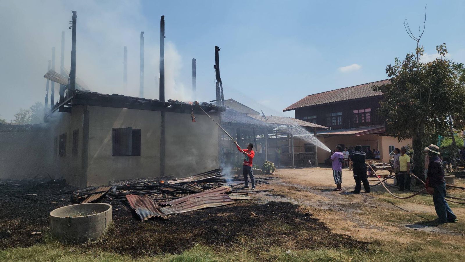 เพลิงไหม้บ้านวอดทั้งหลัง เจ้าของบ้านพยายามเข้าไปขนทรัพย์สิน โชคดีเพื่อนบ้านช่วยนำตัวออกมาได้อย่างปลอดภัย