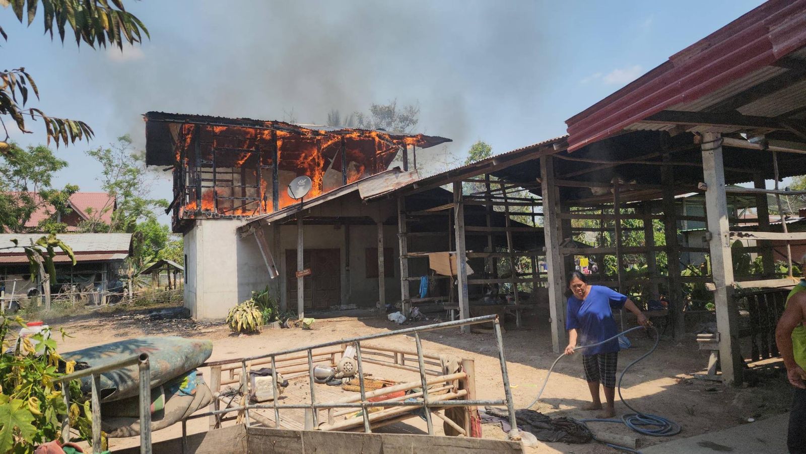 โดยเพื่อนบ้านที่อยู่ติดกัน เล่าเหตุการณ์ว่าก่อนเกิดเหตุ ตนได้ยินเสียงดังที่ชั้น 2 ของบ้านหลังเกิดเหตุ ก่อนจะมีประกายไฟ และเห็นไฟกำลังลุกไหม้จากชั้น 2 ตอนนั้นตนก็ร้องตะโกนเรียกพี่น้อง เรียกชาวบ้านคนอื่นๆ ให้เข้ามาช่วยดับไฟ และพาตัวเจ้าของบ้านออกมาจากบ้านที่กำลังถูกไฟไหม้ ซึ่งตามปกติทุกวัน เจ้าของบ้านจะชอบนอนอยู่ในบ้าน และจะไม่ค่อยมีใครเข้าไปยุ่งวุ่นวายกับแก โชคดีที่ตนเห็นเหตุการณ์ก่อน จึงเข้าไปช่วยออกมาจากบ้านได้ทัน เพราะตอนนั้น ที่บ้านไม่มีใครอยู่เลยมีเพียงเจ้าของบ้านอยู่บ้านคนเดียว แล้วหวงทรัพย์สิน พยายามจะเข้าไปเอาของในบ้าน
