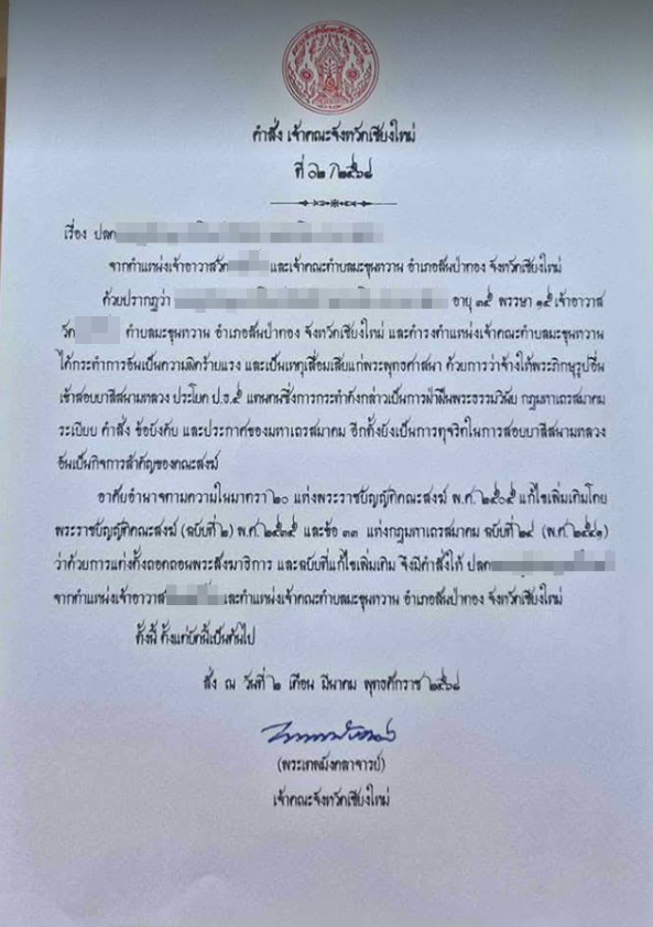 วันที่ 2 มี.ค. 2568 พระเทพมังคลาจารย์ เจ้าคณะจังหวัดเชียงใหม่ ออกหนังสือ เรื่อง ปลดพระครู จากตำแหน่งเจ้าอาวาส และเจ้าคณะตำบล อำเภอสันป่าตอง จังหวัดเชียงใหม่ ด้วยปรากฏว่าพระ … อายุ 35 พรรษา 15 เจ้าอาวาส อำเภอสันป่าตอง จังหวัดเชียงใหม่ และดำรงตำแหน่งเจ้าคณะตำบล