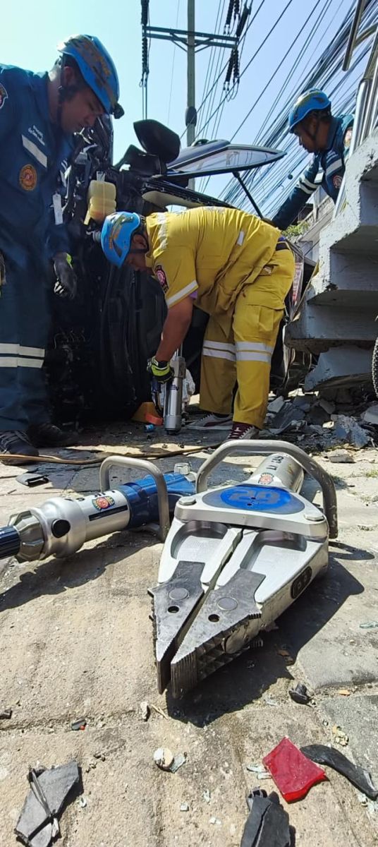 ที่เกิดเหตุ พบรถกระบะ ฟอร์ด เรนเจอร์ สีดำ ทะเบียน กรุงเทพมหานคร ลักษณะพลิกตะแคง อยู่บริเวณบันไดสะพานลอย สภาพรถพังเสียหาย ตรวจสอบภายในห้องโดยสาร พบร่างผู้เสียชีวิต 1 ราย เป็นชายไทย อายุ 56 ปี สภาพถูกรถกดทับอยู่ มีบาดแผลที่ศีรษะขนาดใหญ่ อาสาสมัครต้องใช้อุปกรณ์ตัดถ่าง เพื่อนำร่างออกมาจากซากรถ