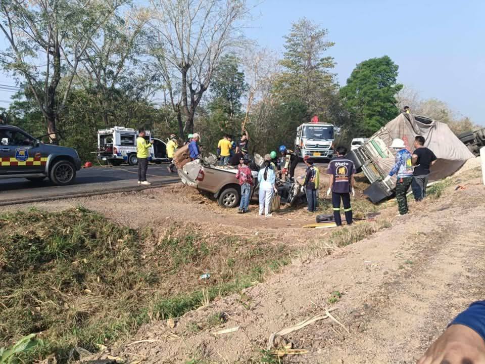 รถพ่วงชนกับรถ 10 ล้อ ก่อนจะล้มทับรถกระบะ มีผู้เสียชีวิตร่างติดอยู่ภายในยานพาหนะ จ.นครราชสีมา