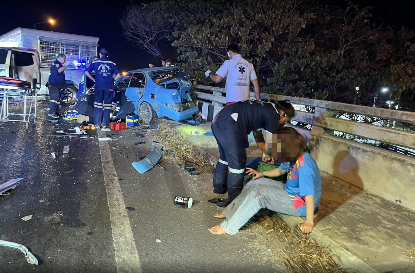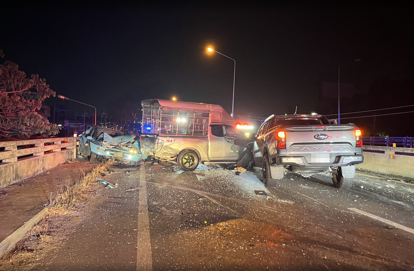 เมื่อเวลา 23:50 น.วันที่ 3 มี.ค.68 เจ้าหน้าที่ตำรวจ สภ.บางบัวทอง จ.นนทบุรี พร้อมอาสาสมัครมูลนิธิป่อเต็กตึ๊งเดินทางเข้าตรวจสอบหลังจากได้รับแจ้งมีรถชนกันกันหลายคันและมีผู้บาดเจ็บหลายราย เหตุเกิดบนสะพานข้ามคลองเจ็ก ถนนสาย 340 (บางบัวทอง-สุพรรณบุรี) ต.ละหาร อ.บางบัวทอง จากนั้นจึงเร่งเข้าตรวจสอบ