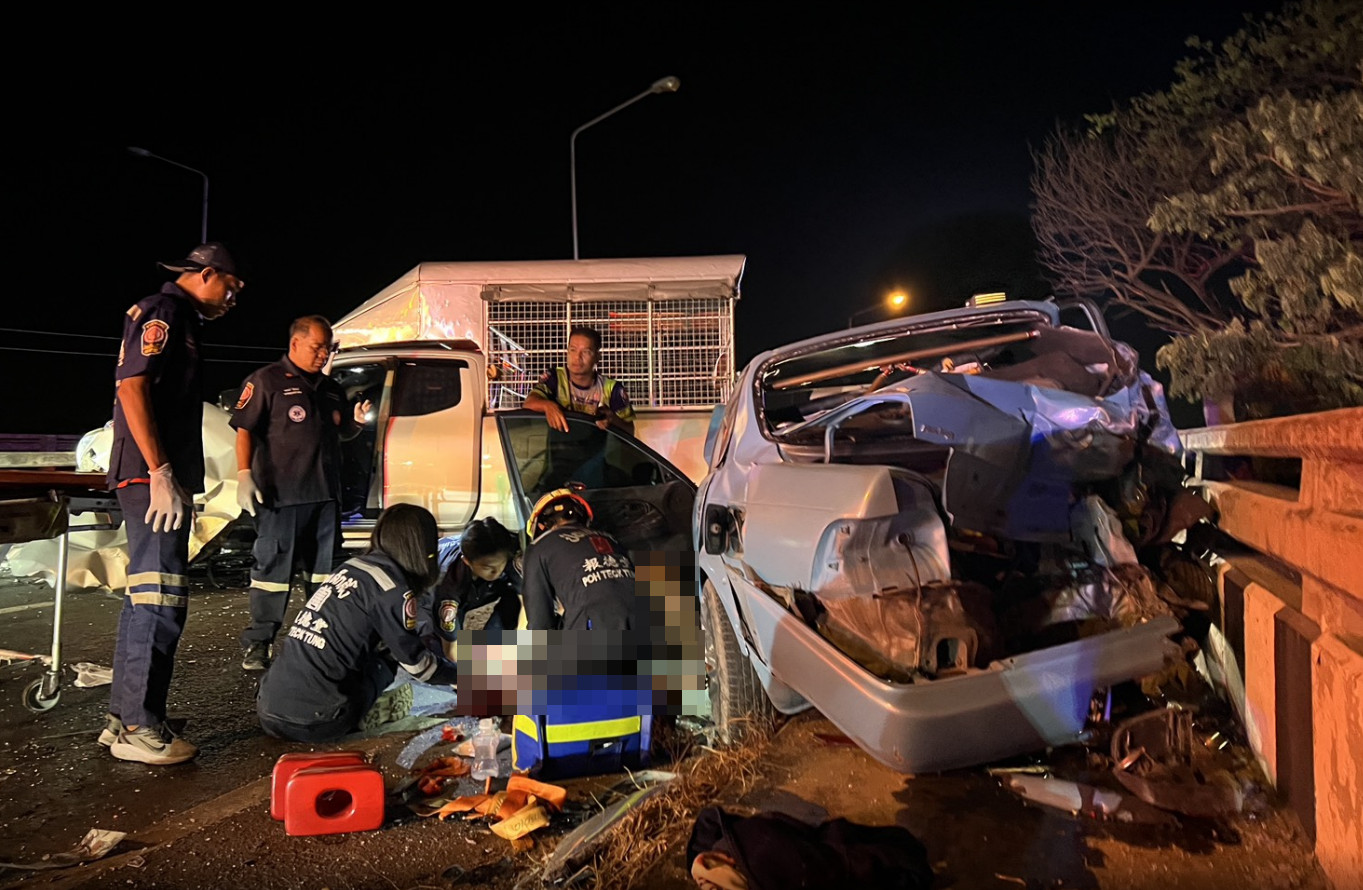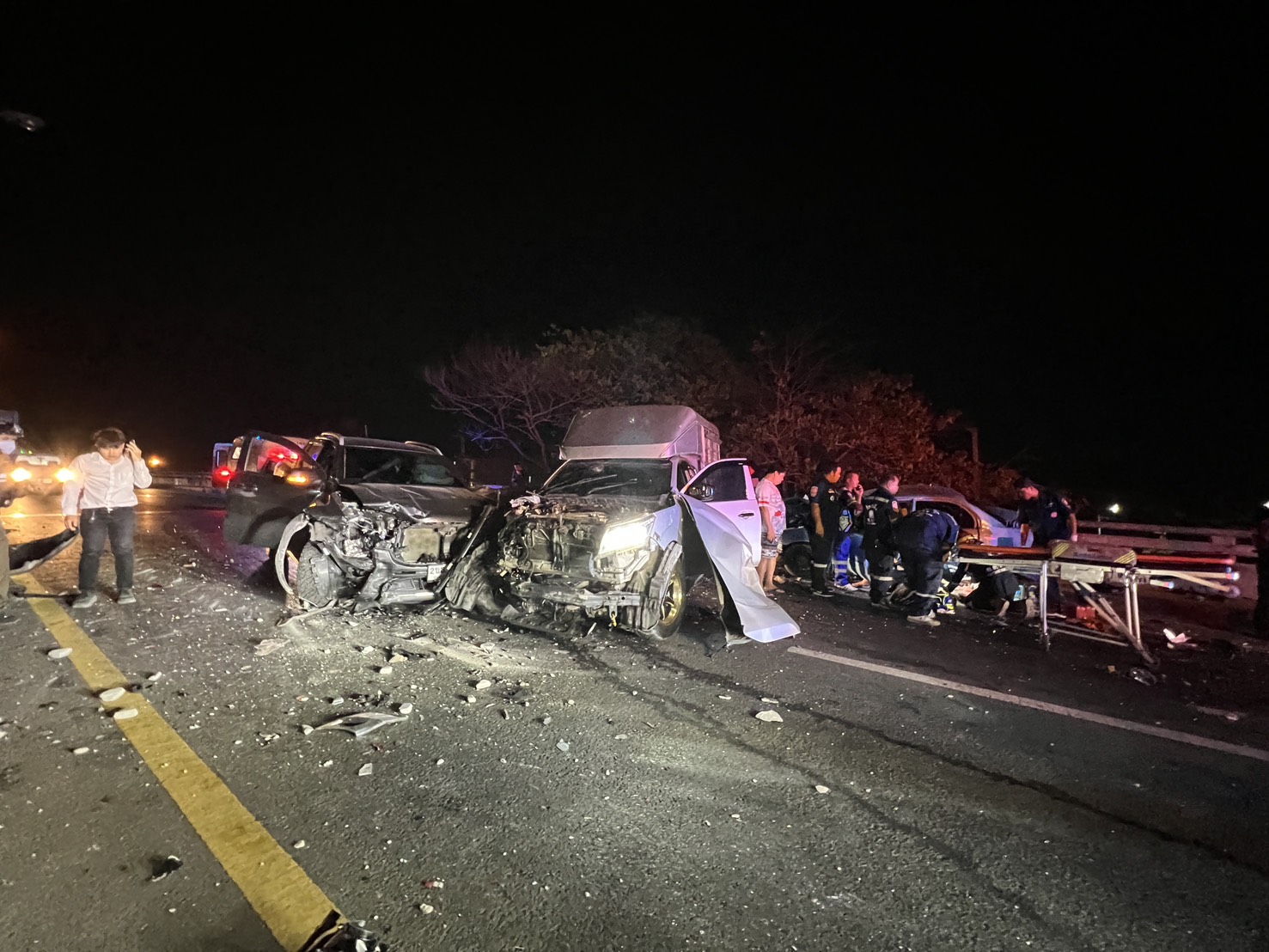 ที่เกิดเหตุถนนสาย 340 (บางบัวทอง-สุพรรณบุรี) ขาเข้า มุ่งหน้าเข้าเขต อ.บางบัวทอง จุดเกิดเหตุอยู่กลางสะพานข้ามคลองเจ็ก พบรถเก๋งยี่ห้อโตโยต้า สีฟ้า ทะเบียน กทม. สภาพรถพังเสียหายยับเยินทั้งด้านหน้าและหลัง ใกล้กันเป็นรถกระบะยี่ห้อนิสสัน รุ่น นาวารา สีบรอนซ์ ทะเบียน กทม. สภาพหน้ารถและท้ายพังเสียหายเช่นกัน ส่วนอีก 1 คันเป็นรถกระบะ ยี่ห้อ ฟอร์ด รุ่น เรนเจอร์ สีเทา ทะเบียน กทม. หน้ารถพังเสียหาย ซึ่งทั้ง 3 คันลักษณะชนอัดติดกันและขวางถนนจนรถอื่นไม่สามารถผ่านทางได้ ขณะเดียวกันทางเจ้าหน้าที่กู้ภัยเร่งช่วยเหลือผู้บาดเจ็บทั้งหมด 3 ราย ชาย อายุ 43 ปี (คนขับ) , หญิง อายุ 39 ปี (นั่งข้างคนขับอาการสาหัส) และหญิงอีกราย อายุ 17 ปี (นั่งเบาะหลัง) โดยทั้ง 3 คนมากับรถเก๋ง เจ้าหน้าที่กู้ภัยเร่งนำตัวส่งโรงพยาบาล ขณะเดียวกันเหตุการณ์นี้ยังมีรถกระบะ ยี่ห้อ มิตซูบิชิ ทะเบียน สุพรรณบุรี ที่บรรทุกชุดโต๊ะหินอ่อนมาเต็มคัน ซึ่งถูกชนที่ด้านท้ายพังเสียหายด้วย