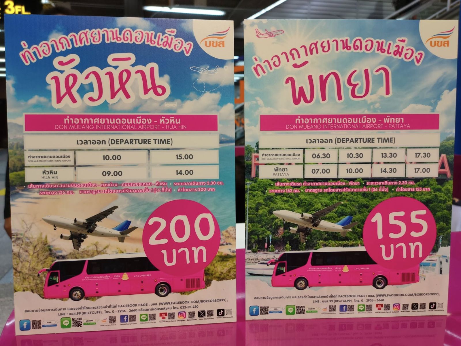 ท่าอากาศยานดอนเมือง - พัทยา จ.ชลบุรี ค่าโดยสาร 155 บาท ระยะทาง 162 กิโลเมตร เส้นทางเดินรถ ท่าอากาศยานดอนเมือง - ทางพิเศษ (ทางด่วน) - ทางหลวงพิเศษระหว่างเมือง(มอเตอร์เวย์) หมายเลข 7 - พัทยา ใช้ระยะเวลาเดินทาง 2.30 ชั่วโมง ใช้รถโดยสารปรับอากาศ ชั้น 1 จำนวน 36 ที่นั่ง ให้บริการวันละ 8 เที่ยววิ่ง (ไป - กลับ) เที่ยวไป 4 เที่ยววิ่งต่อวัน รถอออกจากท่าอากาศ เวลา 06.30 น., 10:30 น., 13.30 และ 17.30 น. เที่ยวกลับ 4 เที่ยววิ่งต่อวัน รถออกจากพัทยา เวลา 07.00 น.น.,10.00 น, 14:30 น. และ 17.00 น. มีจุดจอดรับ - ส่ง จำนวน 2 จุด ได้แก่ 1.รถออกจากอาคาร Service Hall ติดอาคารผู้โดยสารระหว่างประเทศ อาคาร 1 ด้านทิศเหนือของท่าอากาศยานดอนเมือง และ 2.รถออกจากจุดจอด บขส. ถนนสุขุมวิท ฝั่งขาออก ระหว่างพัทยาเหนือ - กลาง