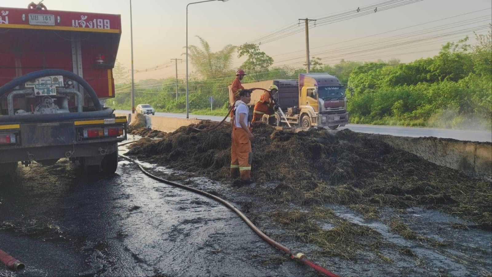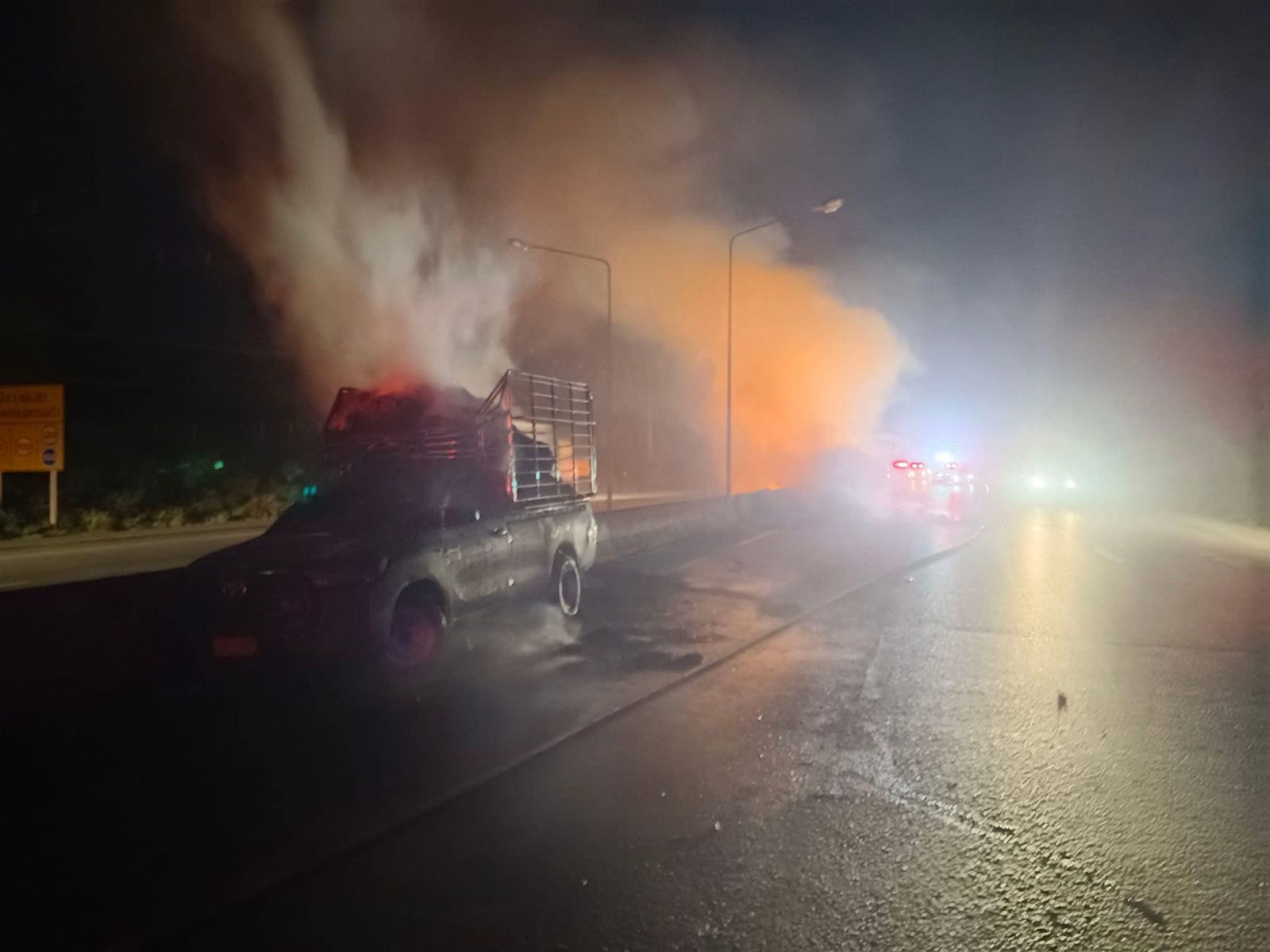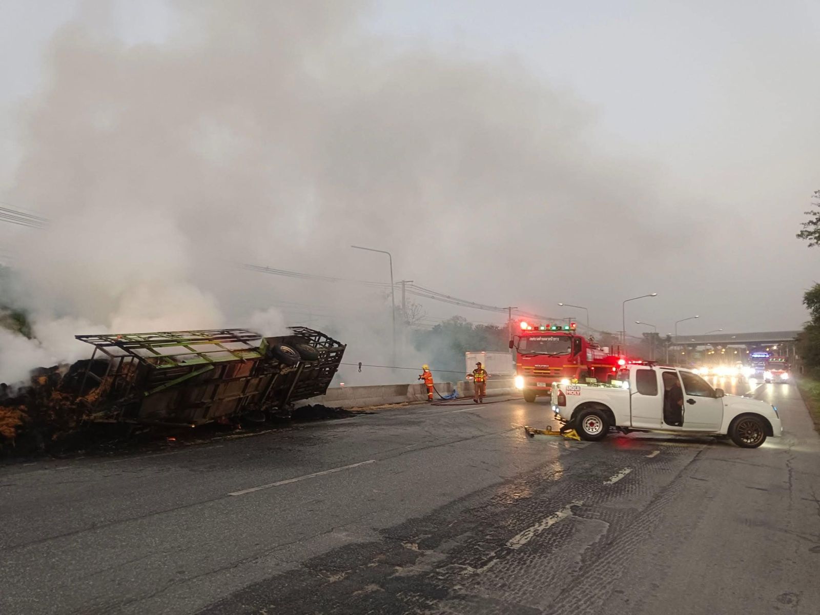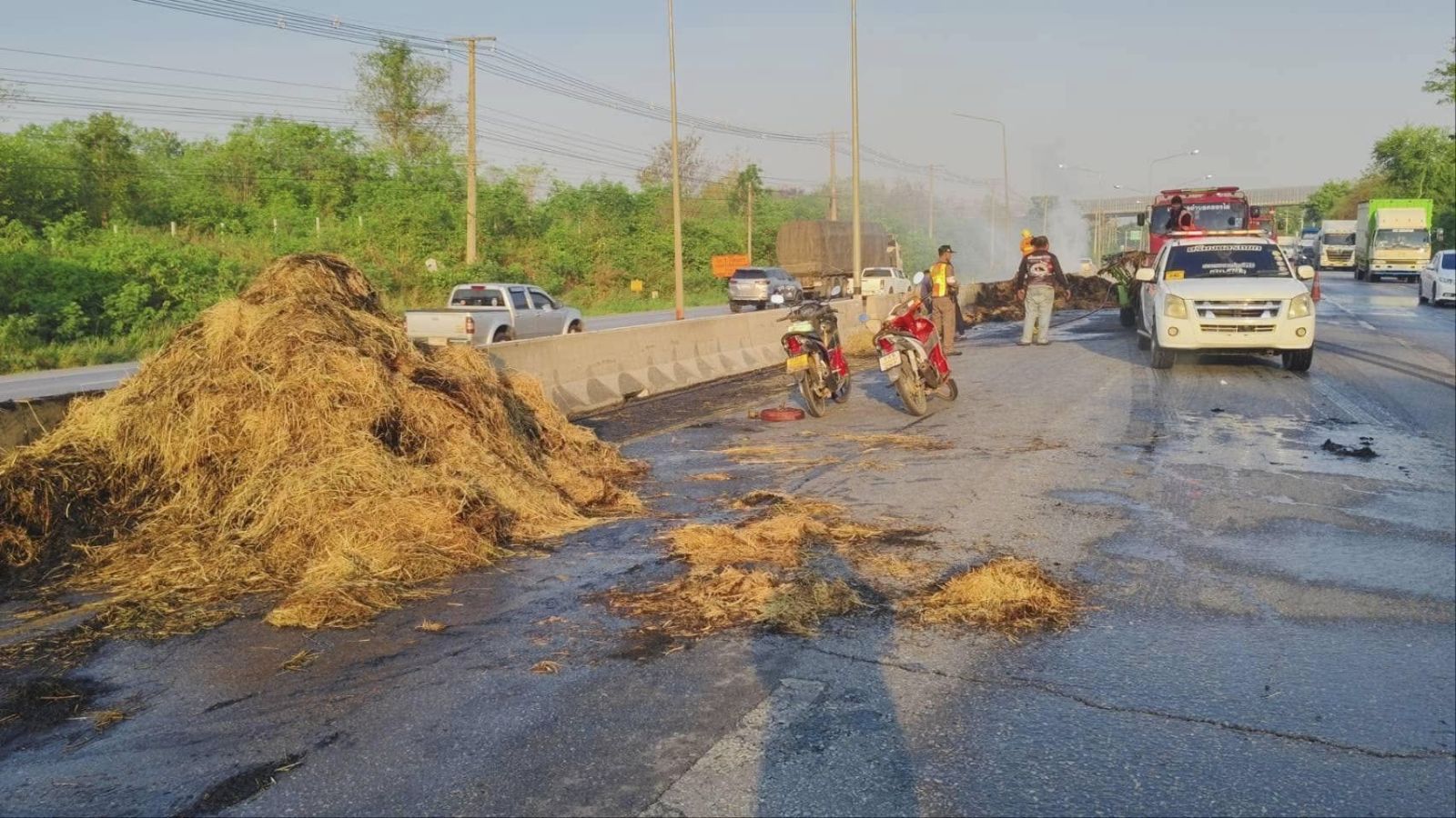 ที่เกิดเหตุอยู่บน ถ.มิตรภาพ ช่วงหลักกิโลเมตรที่ 88+500 ขาเข้า นครราชสีมา พบเพลิงกำลังลุกไหม้รถกระบะ ทะเบียน จ.พิจิตร ซึ่งบรรทุกกองฟางมาเต็มคันรถ เจ้าหน้าที่ดับเพลิงของเทศบาลตำบล คลองไผ่ พร้อมอาสาสมัครหน่วยกู้ภัย ฮุก.31 นครราชสีมา จุด อ.สีคิ้ว และเจ้าหน้าที่ตำรวจต้องระดมกำลังปิดกั้นเส้นทางสัญจรและฉีดน้ำดับเพลิงที่กำลังไหม้กองฟางและลุกลามไหม้ทรัพย์สินทางราชการ ทั้งแท่งคอนกรี ตแบริเออร์ แบ่งทิศทางจราจร และเสาไฟฟ้าส่องสว่างข้างทางใช้เวลากว่า 30 นาที จึงสามารถควบคุมเพลิงได้ แต่ต้องคอยฉีดน้ำไว้เรื่อยๆ ป้องกันไฟปะทุขึ้นมาอีก ส่วนผู้บาดเจ็บเป็นชาย 1 หญิง 1 ได้นำส่งไปรักษาที่โรงพยาบาลสีคิ้ว