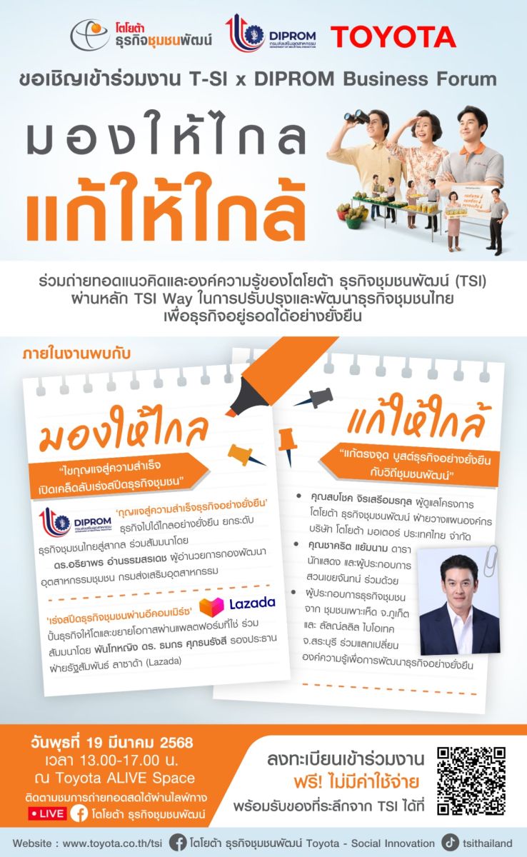 ผู้ประกอบการห้ามพลาด! งานสัมมนาดีๆ อย่าง T-SI x DIPROM Business Forum ในหัวข้อ “มองให้ไกล แก้ให้ใกล้” ที่โตโยต้า ธุรกิจชุมชนพัฒน์ (TSI) และ กรมส่งเสริมอุตสาหกรรม (DIPROM) ร่วมกันจัดขึ้นเพื่อถ่ายทอดแนวคิดและองค์ความรู้เพื่อพัฒนาธุรกิจอย่างยั่งยืน ผ่านหลักวิถีแห่งโตโยต้า ธุรกิจชุมชนพัฒน์ (TSI Way) ให้ทุกคนได้เข้าใจและสามารถนำความรู้ดีๆ กลับไปปรับใช้จริงกับธุรกิจของตัวเองได้ทันที โดยงานนี้จัดขึ้นในวันพุธที่ 19 มีนาคม 2568 เวลา 13.00-17.00 น. ณ Toyota ALIVE Space บางนา