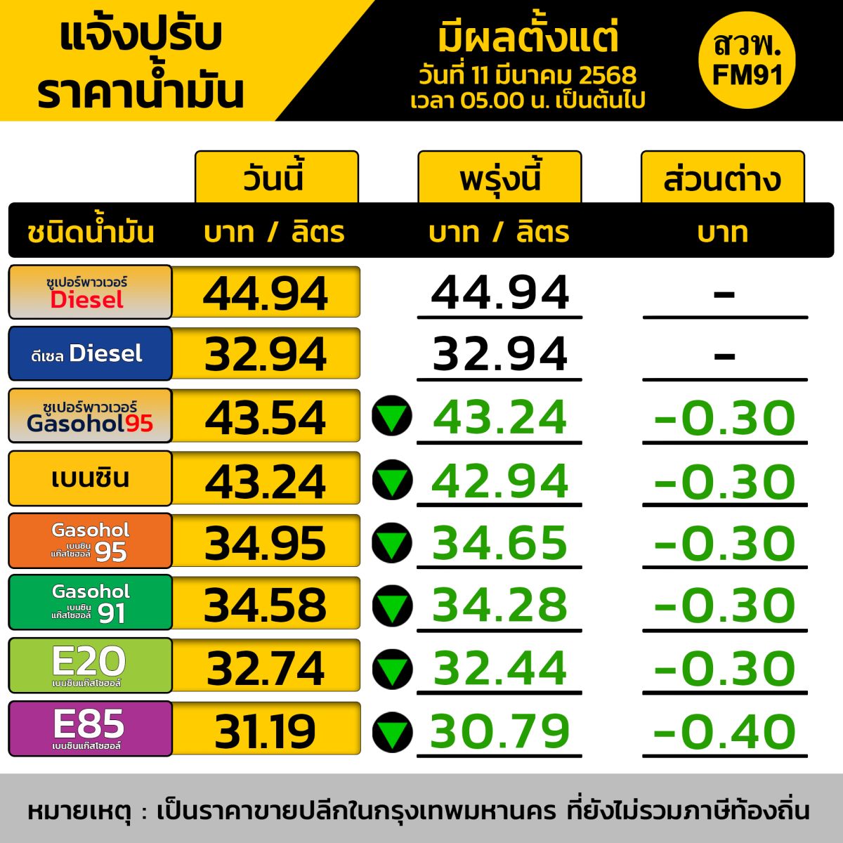 มีผลวันที่ 11 มี.ค. 68 ตั้งแต่ เวลา 05.00 น. เป็นต้นไป