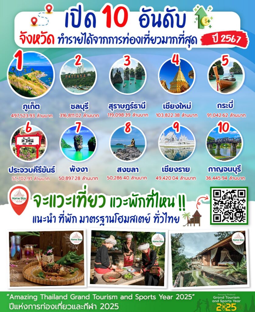 12 มีนาคม 2568 กรมการท่องเที่ยว เปิด 10 อันดับ จังหวัดทำรายได้จากการท่องเที่ยวมากที่สุด ปี 2567 ชวนเที่ยวทั่วไทย ในปีแห่งการท่องเที่ยวและกีฬา "Amazing Thailand Grand Tourism and Sports Year 2025"