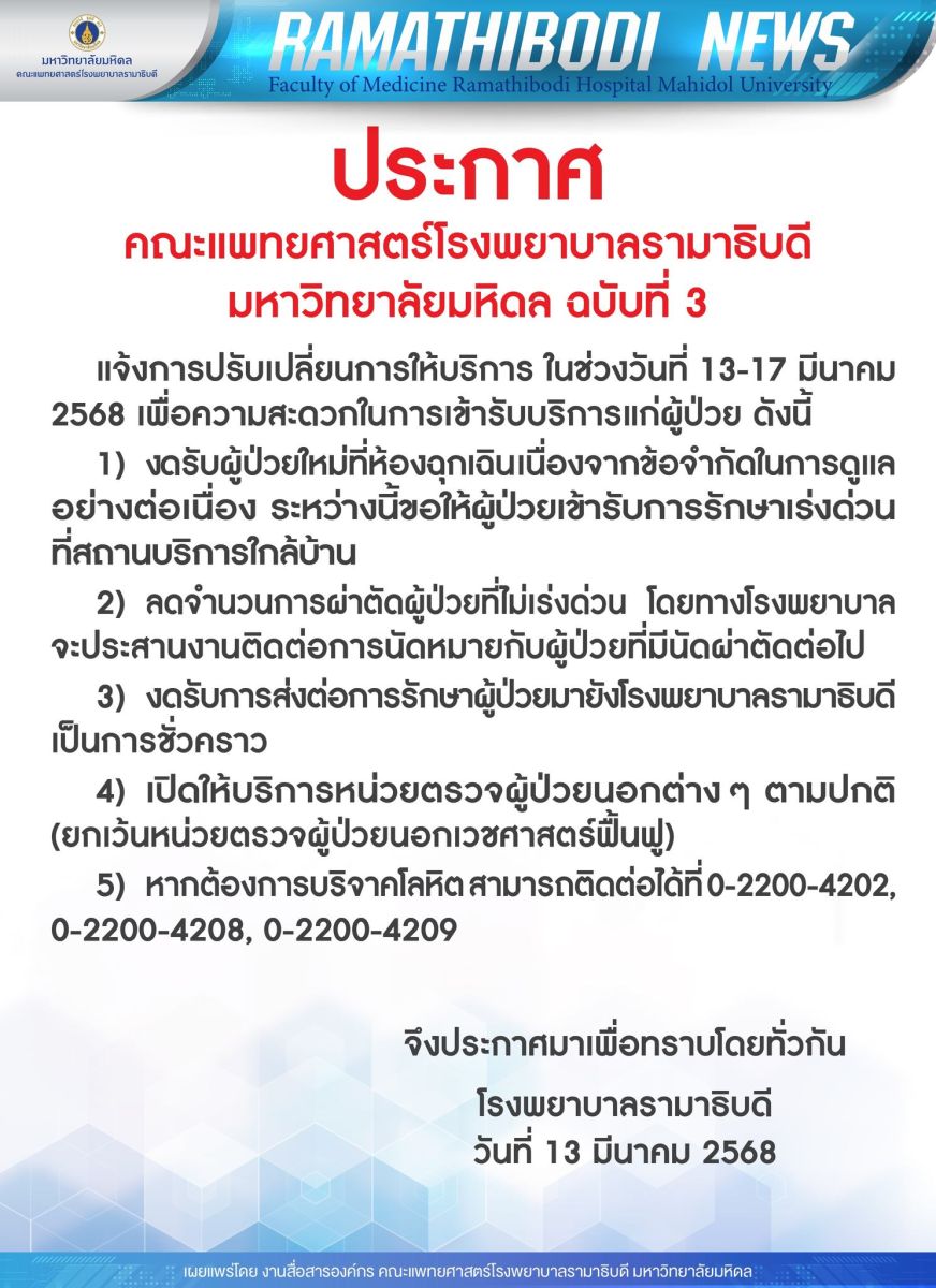 คณะแพทยศาสตร์โรงพยาบาลรามาธิบดี มหาวิทยาลัยมหิดล ฉบับที่ 3 : แจ้งการปรับเปลี่ยนการให้บริการ ในช่วงวันที่ 13-17 มีนาคม 2568 เพื่อความสะดวกในการเข้ารับบริการแก่ผู้ป่วย ดังนี้