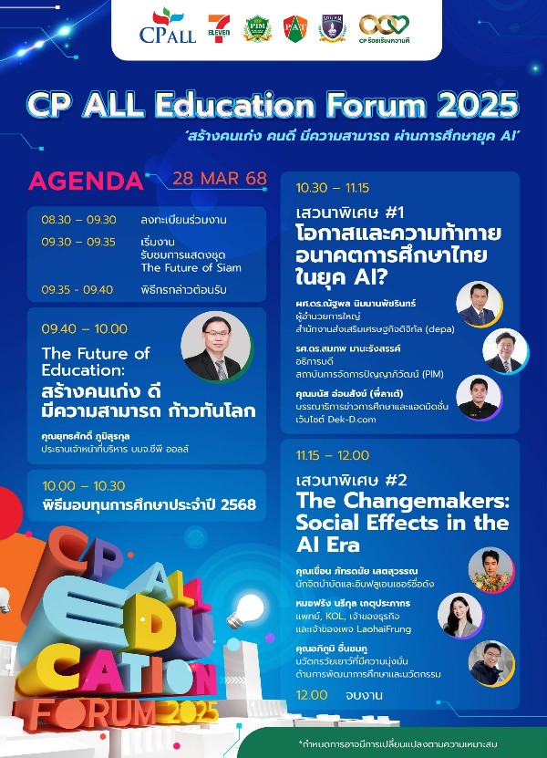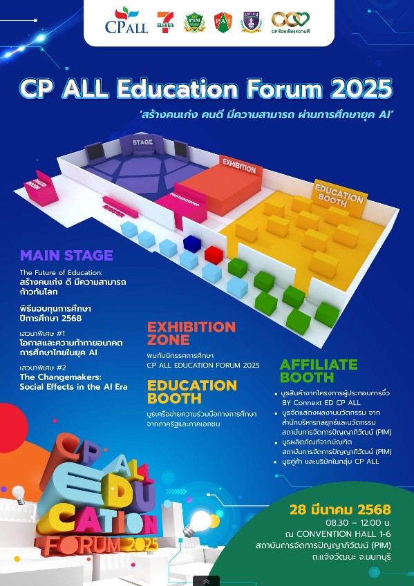 บริษัท ซีพี ออลล์ จำกัด (มหาชน) ร่วมกับ สถาบันการจัดการปัญญาภิวัฒน์ (PIM) วิทยาลัยเทคโนโลยีปัญญาภิวัฒน์ (PAT) และโรงเรียนสาธิตสถาบันการจัดการปัญญาภิวัฒน์ จัดงานสัมมนา “CP ALL EDUCATION FORUM 2025: สร้างคนเก่ง คนดี มีความสามารถ ผ่านการศึกษายุค AI” ขนทัพเหล่ากูรูผู้เชี่ยวชาญด้านการศึกษาและเทคโนโลยี จากหน่วยงานภาครัฐ ภาคเอกชน และสื่อ พร้อมตัวจริงจากหลากหลายวงการ อาทิ อินฟลูเอนเซอร์ชื่อดัง นวัตกรรุ่นใหม่ ที่จะมาร่วมถ่ายทอดมุมมอง แบ่งปันประสบการณ์ ชวนค้นหาคำตอบการศึกษาไทยในยุคที่ “AI” เปลี่ยนโลกอย่างรวดเร็ว การศึกษาไทยจะก้าวทันและพัฒนาคนให้ เก่ง ดี มีความสามารถได้อย่างไร? ให้พร้อมรับความท้าทายแห่งอนาคต