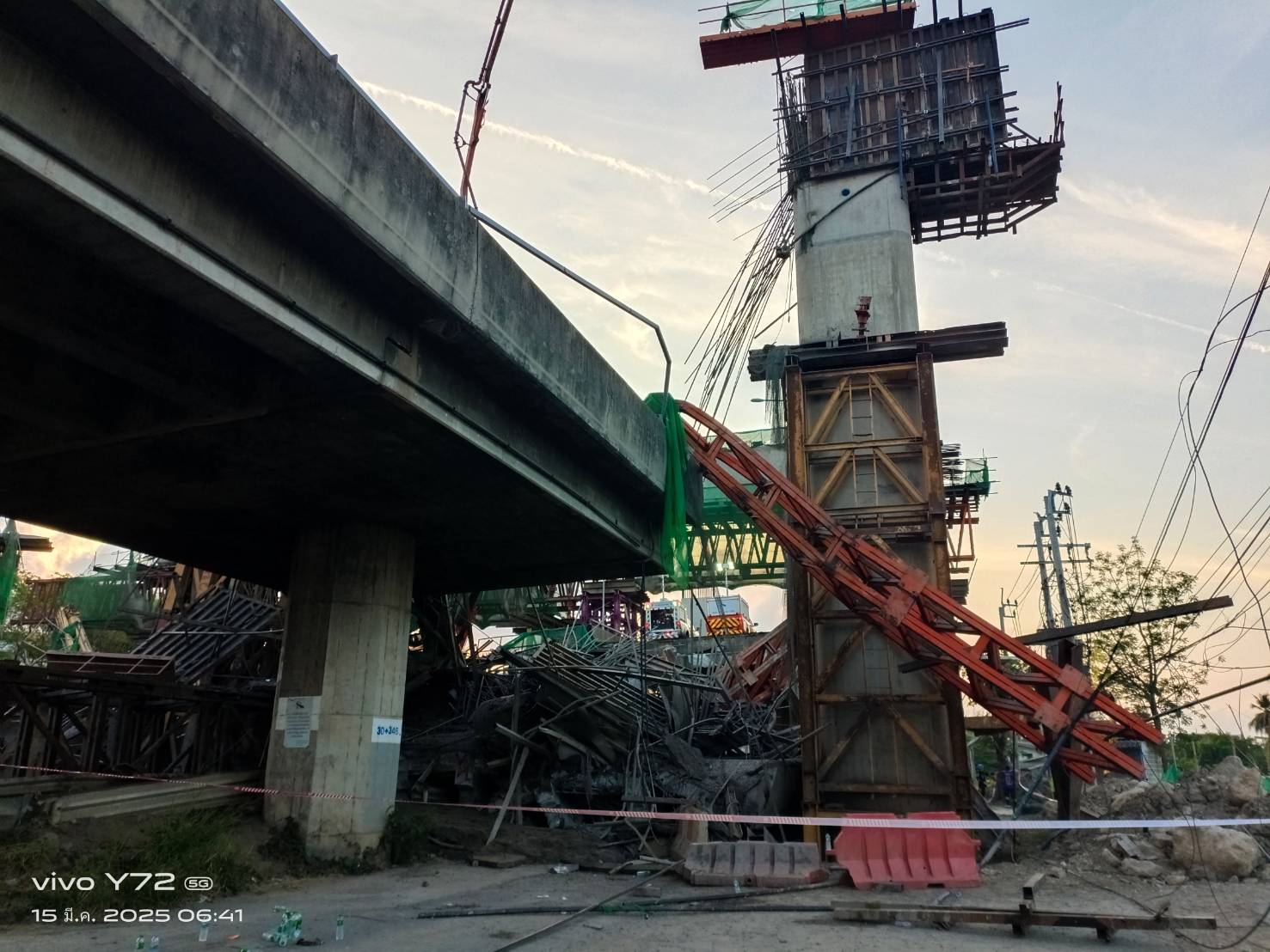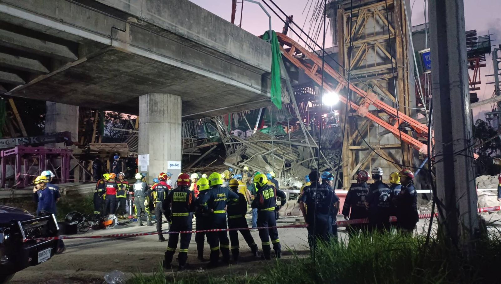 ที่เกิดเหตุพบโครงเหล็กก่อสร้างทางด่วนต่างระดับ ลักษณะเป็นตอม่อสะพานที่อยู่ระหว่างการก่อสร้าง ถล่มต่อเนื่องเป็นทางยาวตั้งแต่ ซอย 17 ถึง 25