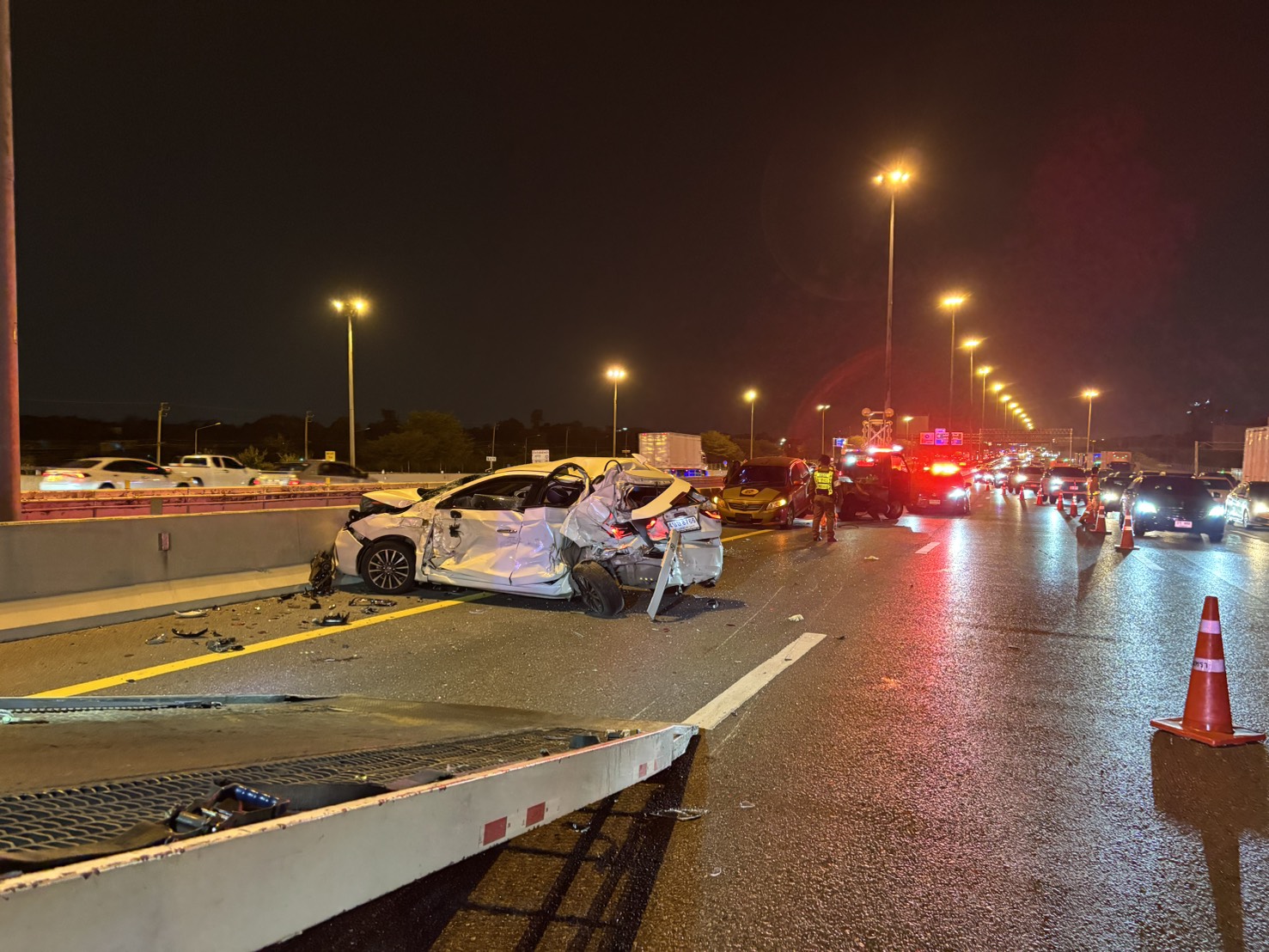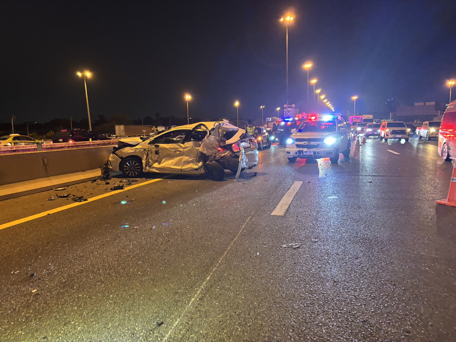 เมื่อเวลา 19.00 น. วันที่ 18 มีนาคม 2568 เกิดอุบัติเหตุบนวงแหวนกาญจนาภิเษก ฝั่งตะวันออก (ทล.9) มุ่งหน้าบางพลี จุดเกิดเหตุอยู่บริเวณ กม.46+900 เหนือถนนรามอินทรา เบื้องต้นเป็นอุบัติเหตุ รถชนกัน จำนวน 4 คัน เป็นรถนั่งส่วนบุคคล 2 คัน และรถกระบะ 2 คัน จากความรุนแรงส่งผลให้มีผู้เสียชีวิต 1 ราย และมีผู้ได้รับบาดเจ็บ 5 ราย เจ้าหน้าที่ได้ให้การช่วยเหลือผู้ได้รับบาดเจ็บนำส่งโรงพยาบาลใกล้เคียง ส่วนสาเหตุของการเกิดอุบัติเหตุอยู่ระหว่างการสอบสวนของเจ้าหน้าที่ตำรวจต่อไป