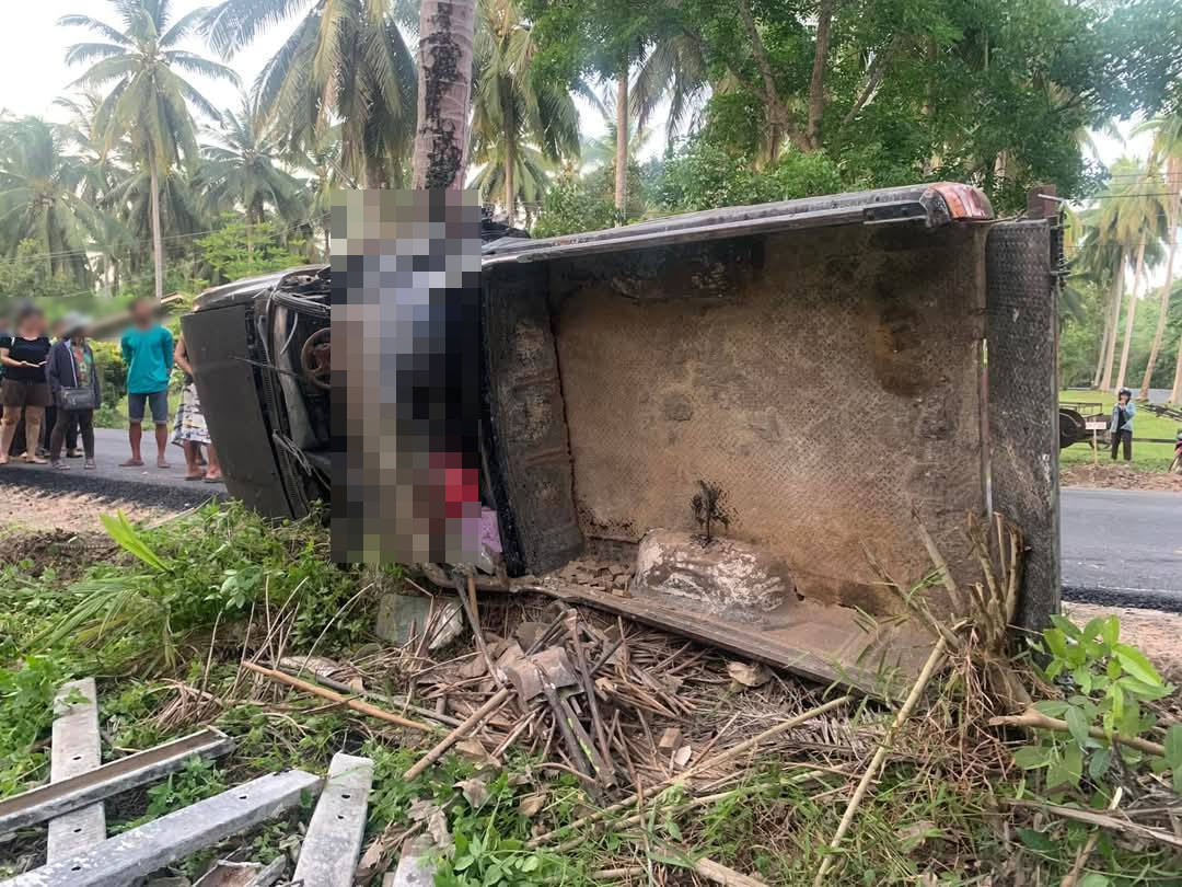 รถกระบะเสียหลักพลิกตะแคงฟาดเข้ากับต้นไม้ข้างทาง มีผู้บาดเจ็บ 2 รายและเสียชีวิต 1 ราย จ.ชุมพร