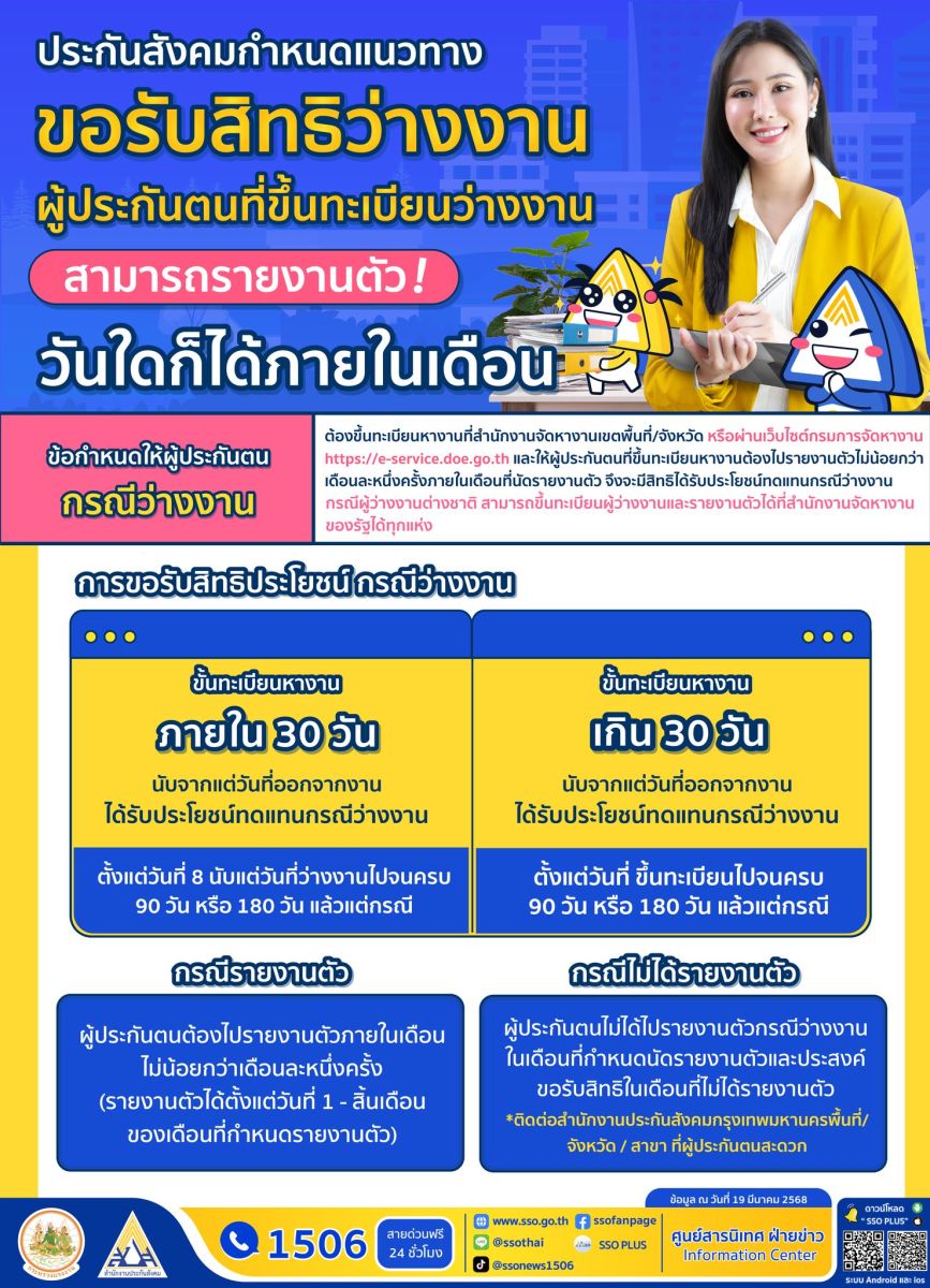 นางมารศรี ใจรังษี เลขาธิการสำนักงานประกันสังคม กล่าวว่า สำนักงานประกันสังคม กำหนดให้ผู้ประกันตนขอรับสิทธิประโยชน์ทดแทนกรณีว่างงาน ต้องไปขึ้นทะเบียนผู้ว่างงานที่สำนักงานจัดหางานเขตพื้นที่/จังหวัด หรือผ่านเว็บไซต์กรมการจัดหางาน http://e-service.doe.go.th และผู้ประกันตนที่ขึ้นทะเบียนผู้ว่างงานต้องไปรายงานตัวไม่น้อยกว่าเดือนละหนึ่งครั้งภายในเดือนที่นัดรายงานตัว จึงจะมีสิทธิได้รับสิทธิประโยชน์ทดแทนกรณีว่างงาน สำหรับกรณีผู้ประกันตนที่ไม่ใช่สัญชาติไทย สามารถขึ้นทะเบียนผู้ว่างงานและรายงานตัวได้ที่สำนักงานจัดหางานของรัฐได้ทุกแห่ง