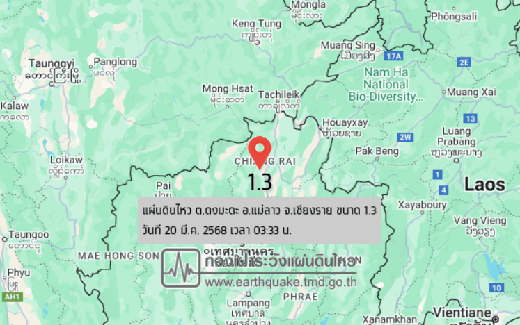 วันที่ 20 มีนาคม 2568 เวลา 03.33 น. กองเฝ้าระวังแผ่นดินไหว กรมอุตุนิยมวิทยา แจ้งเหตุแผ่นดินไหว ขนาด 1.3 ความลึก 4 กม. ภายในพื้นที่ของ ต.ดงมะดะ อ.แม่ลาว จ.เชียงราย (19.76°N,99.66°E) ยังไม่มีรายงานผลกระทบจากแรงสั่นสะเทือน