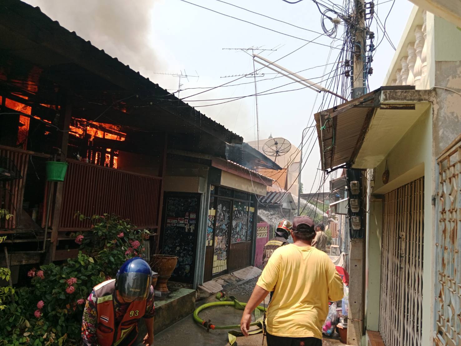 อาสาสมัคร มูลนิธิเสมอกันกู้ภัยสุพรรณบุรี เขตเมือง พร้อมด้วย รถน้ำดับเพลิง บรรเทาสาธารณภัย จำนวนหลายคัน เข้าร่วมในที่เกิดเหตุ พบเพลิงกำลังลุกไหม้บ้านไม้อย่างรุนแรง เจ้าหน้าที่ดับเพลิงดำเนินการระดมฉีดน้ำระงับเพลิง ใช้เวลารวมกว่า 40 นาที จึงสามารถควบคุมเพลิงไว้ได้