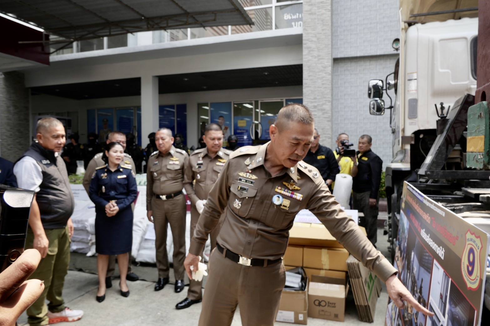 สืบเนื่องจากเมื่อวันที่ 21 มีนาคม 2568 เวลาประมาณ 17:45 น. เจ้าหน้าที่ ตำรวจ กก.สส.บก.น.9 ได้ติดตามเครือข่ายยาเสพติด “โอ บางบัวทอง” มีพฤติกรรมจำหน่ายยาเสพติดอยู่ที่หมู่บ้านหรูย่านบางบัวทอง จ.นนทบุรี โดยเรียกรถรับจ้างมารับยาเสพติดที่ซุกซ่อนไว้ในกล่องพัสดุสินค้า เพื่อตบตาเจ้าหน้าที่ตำรวจและบริษัทขนส่ง เจ้าหน้าที่ตำรวจได้ติดตามรถรับจ้างไปและขอตรวจสอบกล่องพัสดุ พบเป็นยาบ้าจำนวน 600,000 เม็ด บรรจุอยู่ภายในกล่อง จึงได้ขยายผลตรวจค้นบ้านหรูดังกล่าวของ “นายโอ”