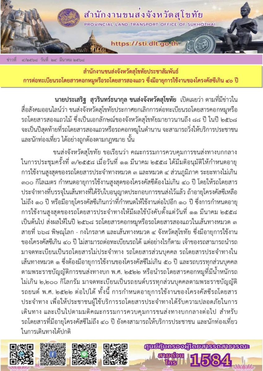 นายประเสริฐ สุวรินทร์ธนากุล ขนส่งจังหวัดสุโขทัย เปิดเผยว่า ตามที่มีข่าวในสื่อสังคมออนไลน์ว่า ขนส่งจังหวัดสุโขทัยประกาศยกเลิกการต่อทะเบียนรถโดยสารคอกหมูหรือรถโดยสารสองแถวไม้ ซึ่งเป็นเอกลักษณ์ของจังหวัดสุโขทัยมายาวนานถึง 88 ปี ในปี 2568 จะเป็นปีสุดท้ายที่รถโดยสารสองแถวหรือรถคอกหมูในตำนาน จะสามารถวิ่งให้บริการประชาชนและนักท่องเที่ยว ได้อย่างถูกต้องตามกฎหมาย นั้น
