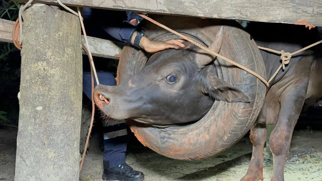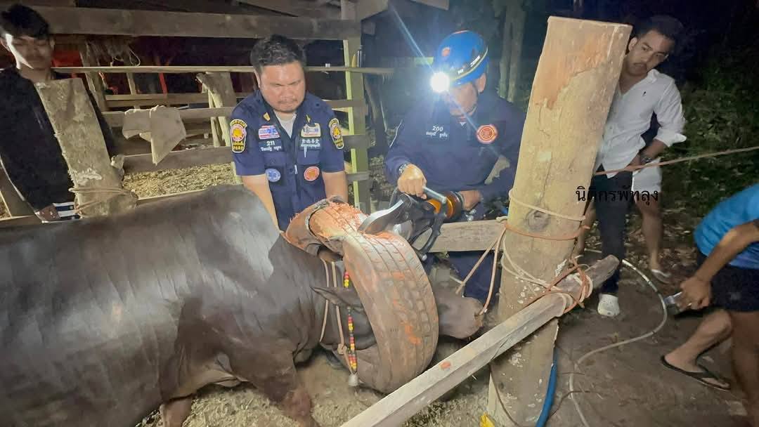 เวลา 20.00 น. วันที่ 25 มีนาคม 2568 ผู้สื่อข่าวรายงานว่า ที่บ้านหลังหนึ่ง ในพื้นที่ หมู่ที่ 3 ตำบลนาท่อม อำเภอเมือง จังหวัดพัทลุง เจ้าหน้าที่กู้ภัยพัทลุง เร่งใช้อุปกรณ์ตัดถ่าง ซึ่งเป็นอุปกรณ์ที่ใช้ตัดชิ้นส่วนรถเพื่อช่วยเหลือประชาชนเกิดอุบัติเหตุ นำมาช่วยตัดเอายางล้อรถยนต์ที่คล้องหัว วัวชน เพศผู้ อายุ 3 ปี