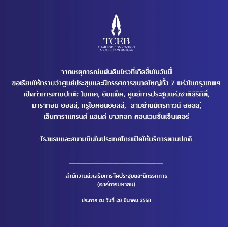 วันนี้(29 มี.ค. 2568 )จากเหตุการณ์แผ่นดินไหวที่เกิดขึ้นใน 28 มี.ค. ที่ผ่านมา ทีเส็บขอเรียนให้ทราบว่า ศูนย์ประชุมและนิทรรศการขนาดใหญ่ทั้ง 7 แห่งในกรุงเทพฯ เปิดทำการตามปกติ: ไบเทค, อิมแพ็ค, ศูนย์การประชุมแห่งชาติสิริกิติ์, พารากอน ฮอลล์, ทรูไอคอนฮอลล์, สามย่านมิตรทาวน์ ฮอลล, เซ็นทาราแกรนด์ แอนด์ บางกอก คอนเวนชั่นเซ็นเตอร์