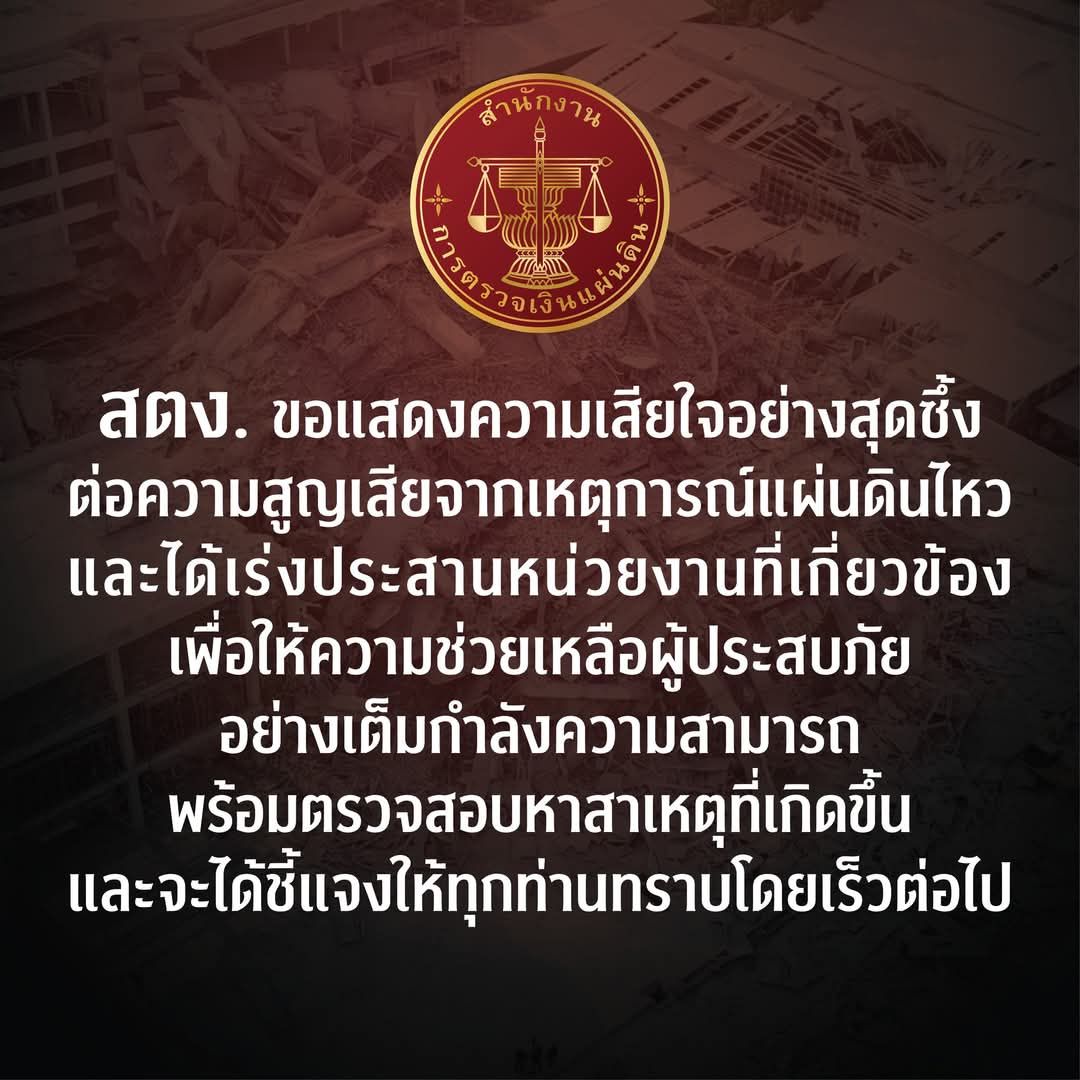 ล่าสุดเพจ สำนักงานการตรวจเงินแผ่นดิน มีความเคลื่อนไหวในเหตุการณ์นี้ว่า “สตง. ขอแสดงความเสียใจอย่างสุดซึ้งต่อความสูญเสียจากเหตุการณ์แผ่นดินไหว และได้เร่งประสานหน่วยงานที่เกี่ยวข้อง เพื่อให้ความช่วยเหลือผู้ประสบภัยอย่างเต็มกำลังความสามารถ” “พร้อมตรวจสอบหาสาเหตุที่เกิดขึ้น และจะได้ชี้แจงให้ทุกท่านทราบโดยเร็วต่อไป”