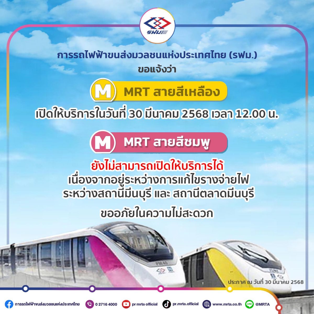 บัดนี้ รถไฟฟ้า MRT สายสีเหลือง ได้ตรวจสอบดำเนินการตรวจสอบความแข็งแรงของโครงสร้าง ทางวิ่ง และระบบที่เกี่ยวข้องเรียบร้อยและพร้อมเปิดให้บริการตั้งแต่เวลา 12.00 น. ของวันที่ 30 มีนาคม 2568 เป็นต้น