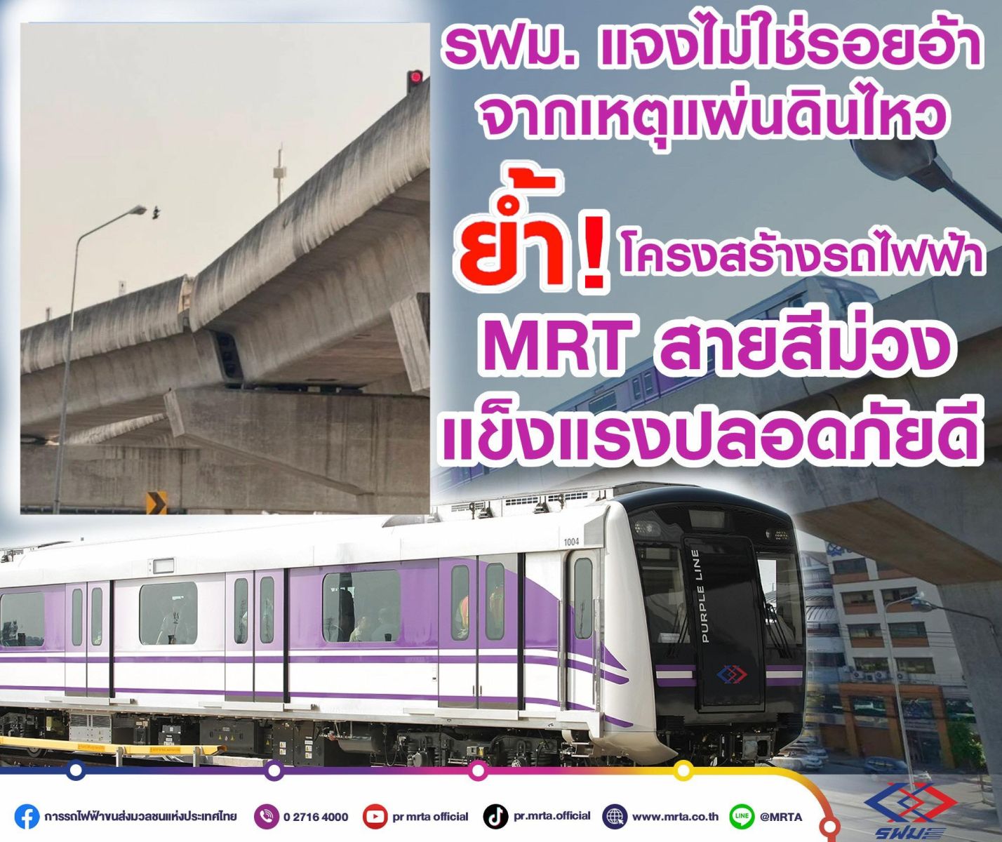 การรถไฟฟ้าขนส่งมวลชนแห่งประเทศไทย (รฟม.) ขอเรียนว่า บริเวณดังกล่าว เป็นช่วงโครงสร้างทางวิ่งที่มีการขยายกว้างขึ้นในจุด Pocket Track ซึ่งเป็นพื้นที่สำหรับกลับขบวนรถไฟฟ้าเพื่อให้บริการต่อ ระหว่างสถานีสะพานพระนั่งเกล้าและสถานีแยกนนทบุรี 1 ซึ่งไม่ใช่การเคลื่อนตัวจากเหตุแผ่นดินไหวแต่อย่างใด รวมถึงจากการตรวจสอบและประเมินความมั่นคงแข็งแรงของโครงสร้างสถานี ทางวิ่ง ระบบรางและงานระบบอื่นๆ ที่เกี่ยวข้อง ไม่พบสิ่งผิดปกติ