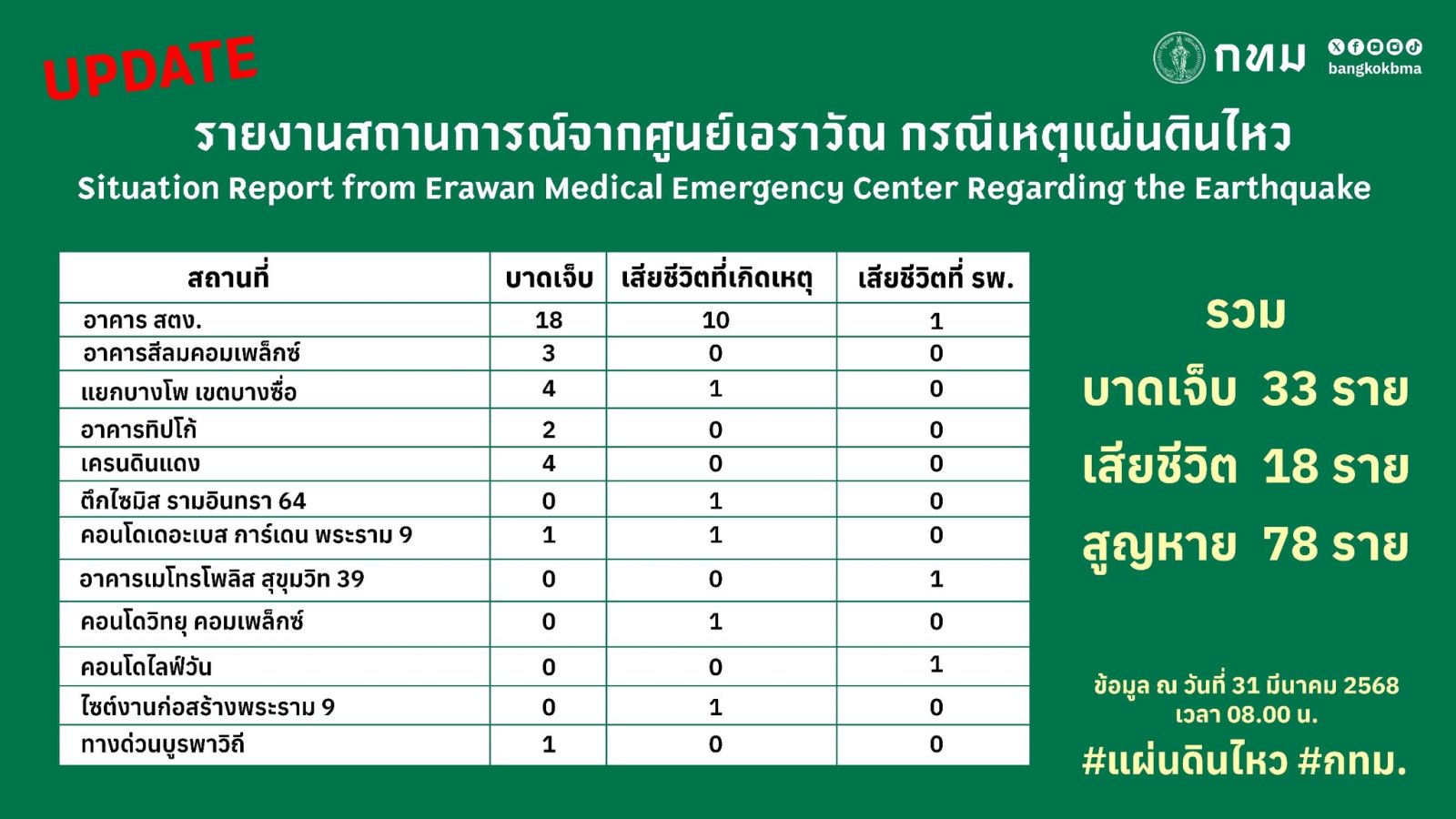 ด้านศูนย์บริการการแพทย์ฉุกเฉิน สำนักการแพทย์ กรุงเทพมหานครรายงานจำนวนผู้บาดเจ็บและเสียชีวิต จากเหตุแผ่นดินไหวตึกถล่มในพื้นที่กรุงเทพมหานคร มีจำนวน 51 ราย แบ่งเป็นบาดเจ็บ 33 ราย เสียชีวิต 18 ราย สูญหาย 78 ราย